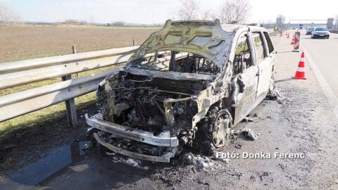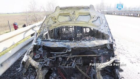 Kigyulladt és teljes terjedelmében égett egy személygépkocsi az M5-ös autópályán, Kecskemétnél.