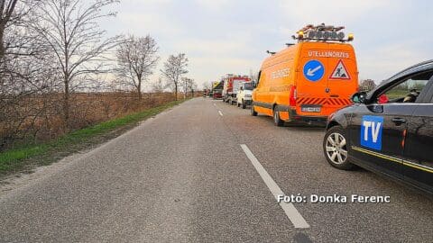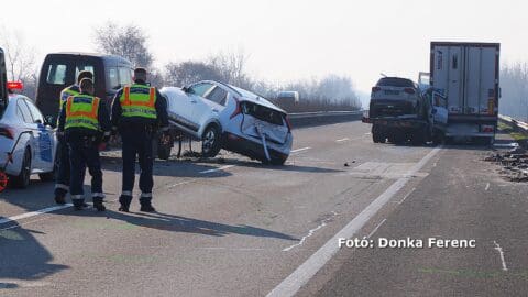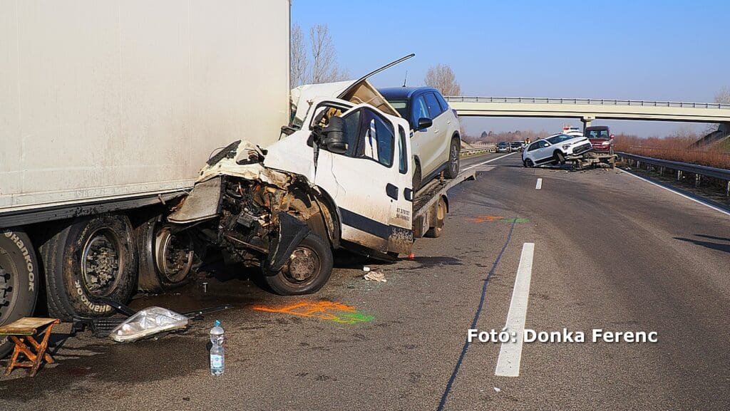 Egy személy súlyosan megsérült, amikor egy kamion és autókat vontató jármű ütközött az M5-ös autópályán, Balástya térségében.