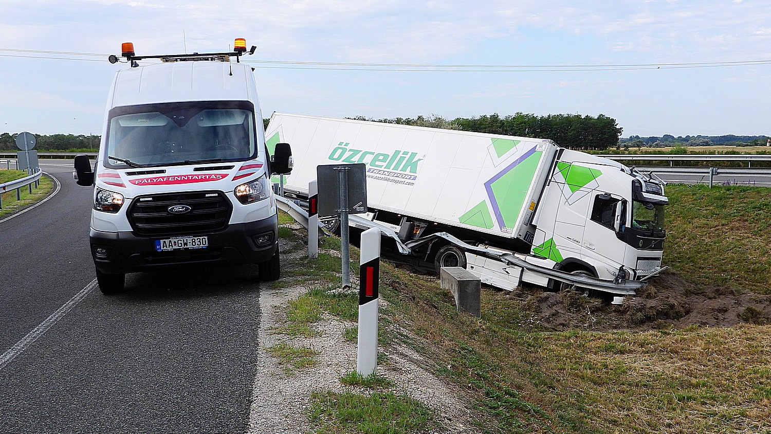A kamion Budapest felé haladt, amikor török vezetője valószínű elaludt, letért a sztrádáról, majd maga alá gyűrte a szalagkorlátot és az árokban oldalára billenve állt meg. A benne egyedül ülő sofőr nem sérült meg.