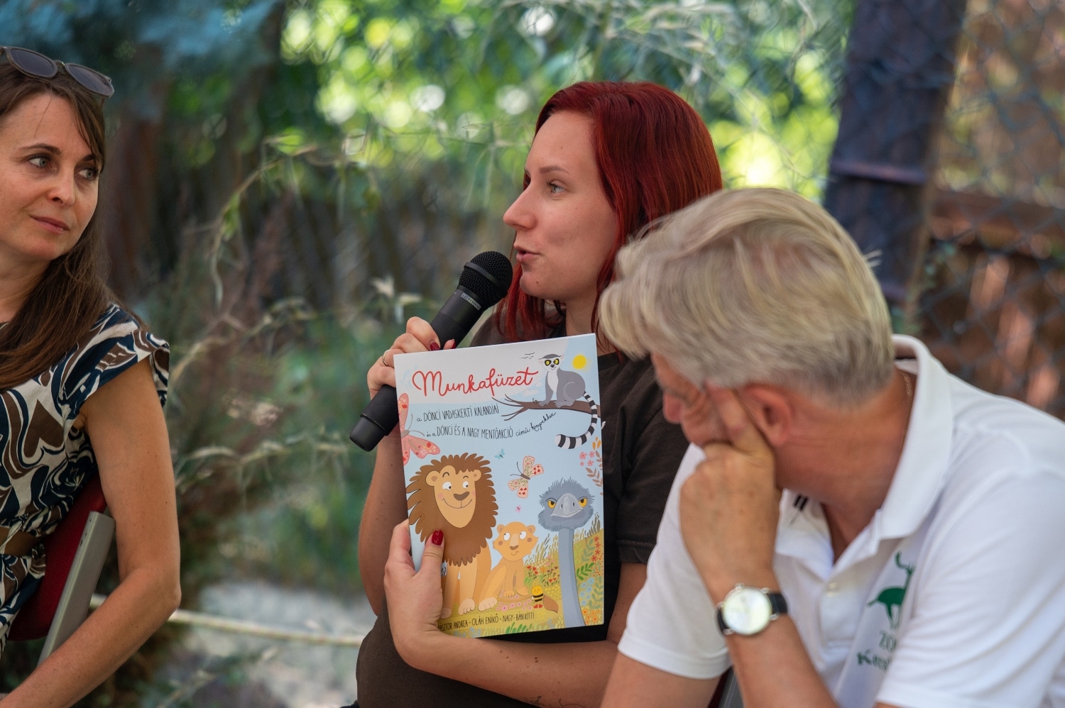 A kecskeméti könyvbemutatón elmondták azt is, hogy a két mesekönyvhöz egy foglalkoztatófüzet is tartozik, amely játékos feladatok, QR-kódokon elérhető videók segítségével ismerteti a vadaskert állatait, illetve a beporzó rovarokat. Erről Oláh Enikő, a vadaskert zoo pedagógusa beszélt a könyvbemutatón.