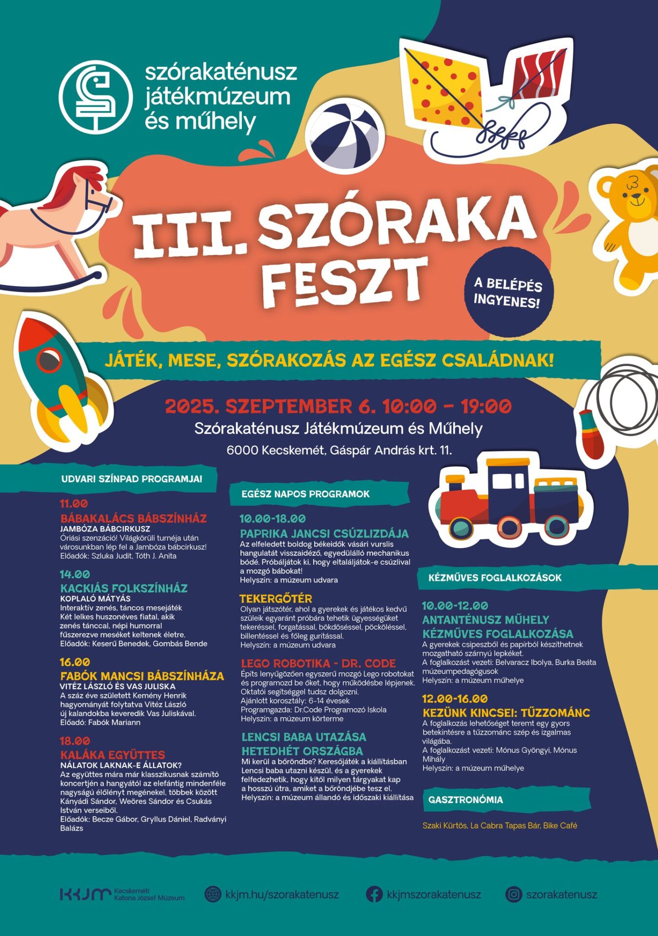 Az immáron több mint 40 éves múlttal rendelkező kecskeméti Szórakaténusz Játékmúzeum és Műhely idén már harmadik alkalommal rendezi meg a SZÓRAKA FESZT-et, mely a játékról és a Szórakaténusz műhelyéről szóló fesztivál és ünnep.