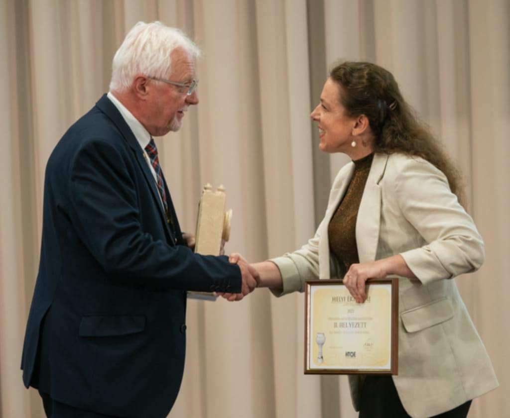 A díjátadón díszoklevelet nyújtott át Lovass Tibor, a HTOE elnöke Kozák Polett ügyvezető-főszerkesztőnek, melyben köszöntötték az idén 40 éves születésnapját ünneplő Kecskeméti Televíziót.