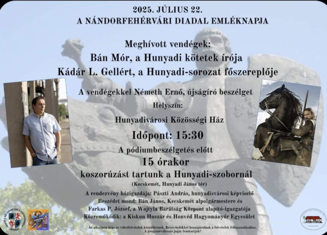 Koszorúzással és pódiumbeszélgetéssel emlékeznek meg a nándorfehérvári diadal emléknapjáról a Hunyadivárosban július 22-én, kedden délután. Az esemény vendége lesz Bán Mór, a Hunyadi-könyvek szerzője és Kádár L. Gellért, a Hunyadi-sorozat főszereplője.