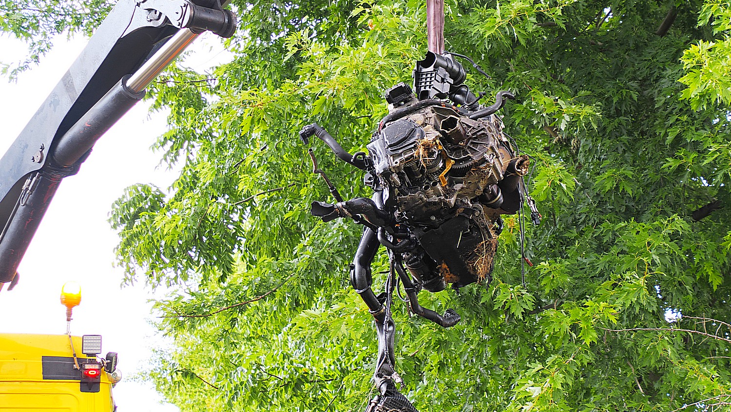 Az autó olyan hatalmas erővel csapódott a fának, hogy a motorja is kiszakadt, és kereke is kitört.