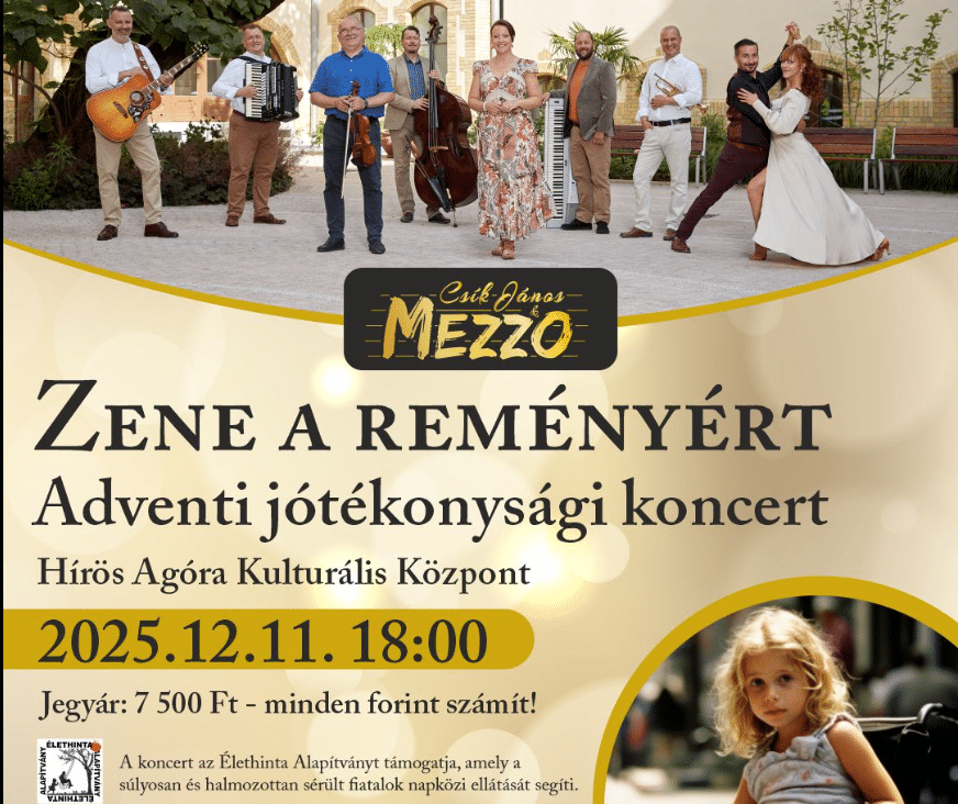 Az adventi időszakban ismét a közösség erejére és az összefogás fontosságára hívják fel a figyelmet a kecskeméti zenészek. December 11-én, csütörtökön a Hírös Agóra Kulturális Központ ad otthont a „Zene reményt ad” jótékonysági estnek, ahol Csík János és a Mezzo lép színpadra, hogy támogassák a súlyosan és halmozottan sérült fiatalokat segítő Élethinta Közhasznú Alapítványt.