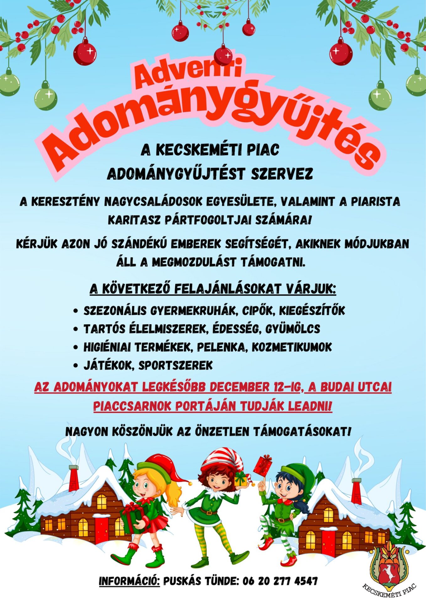 A Kecskeméti Piac karácsonyi adománygyűjtést indít a Keresztény Nagycsaládosok Egyesülete, valamint a Piarista Karitász pártfogoltjai számára.