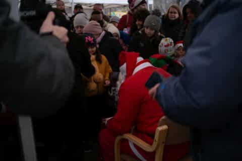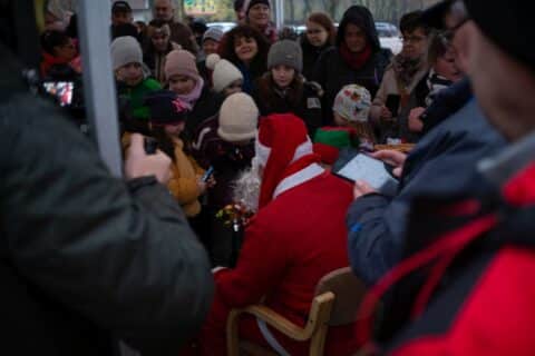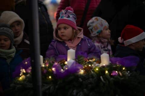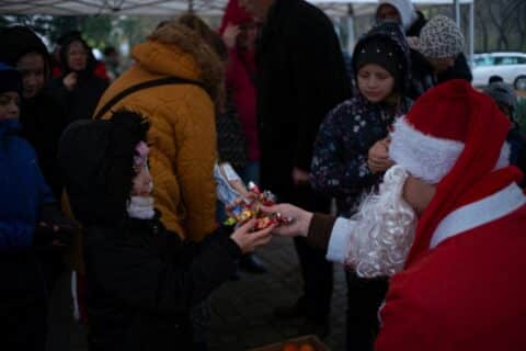 Tokovics Tamás beszéde után Péntek Zsolt megáldotta a városrész adventi koszorúját, meggyújtották az első gyertyát, és következett a nap fénypontja: a Mikulás, aki minden gyermeknek hozott ajándékot.