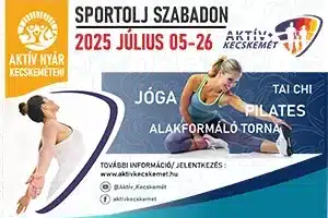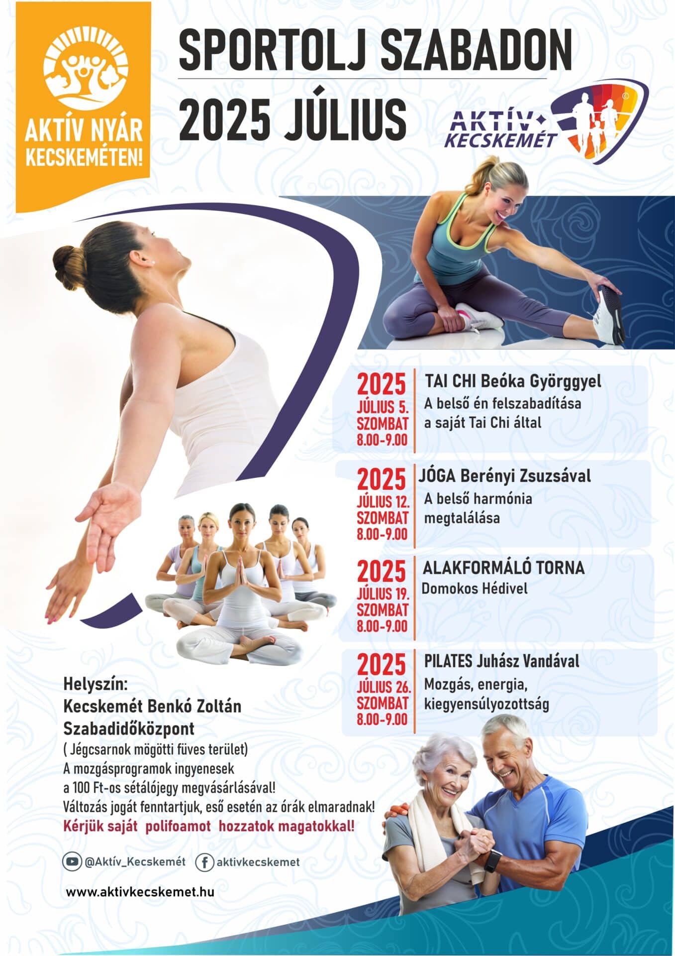 Ennek jegyében indul júliusban az Aktív Kecskemét keretében a Sportolj Szabadon programsorozat a Benkó Zoltán Szabadidőközpontban. Szombatonként reggel 8-órától. A jóga, a Tai Chi, a pilates és alakformáló jóga ingyenesen látogatható majd.