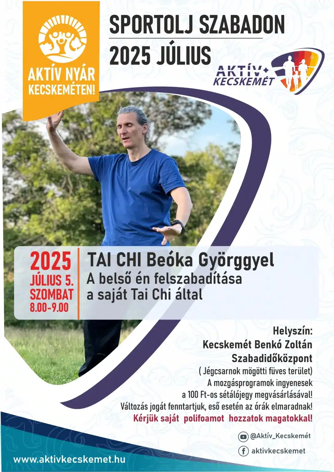 Az első foglalkozásra július 5-én kerül sor, amelynek keretében fel lehet fedezni a Tai Chi erejét Beóka György vezetésével.