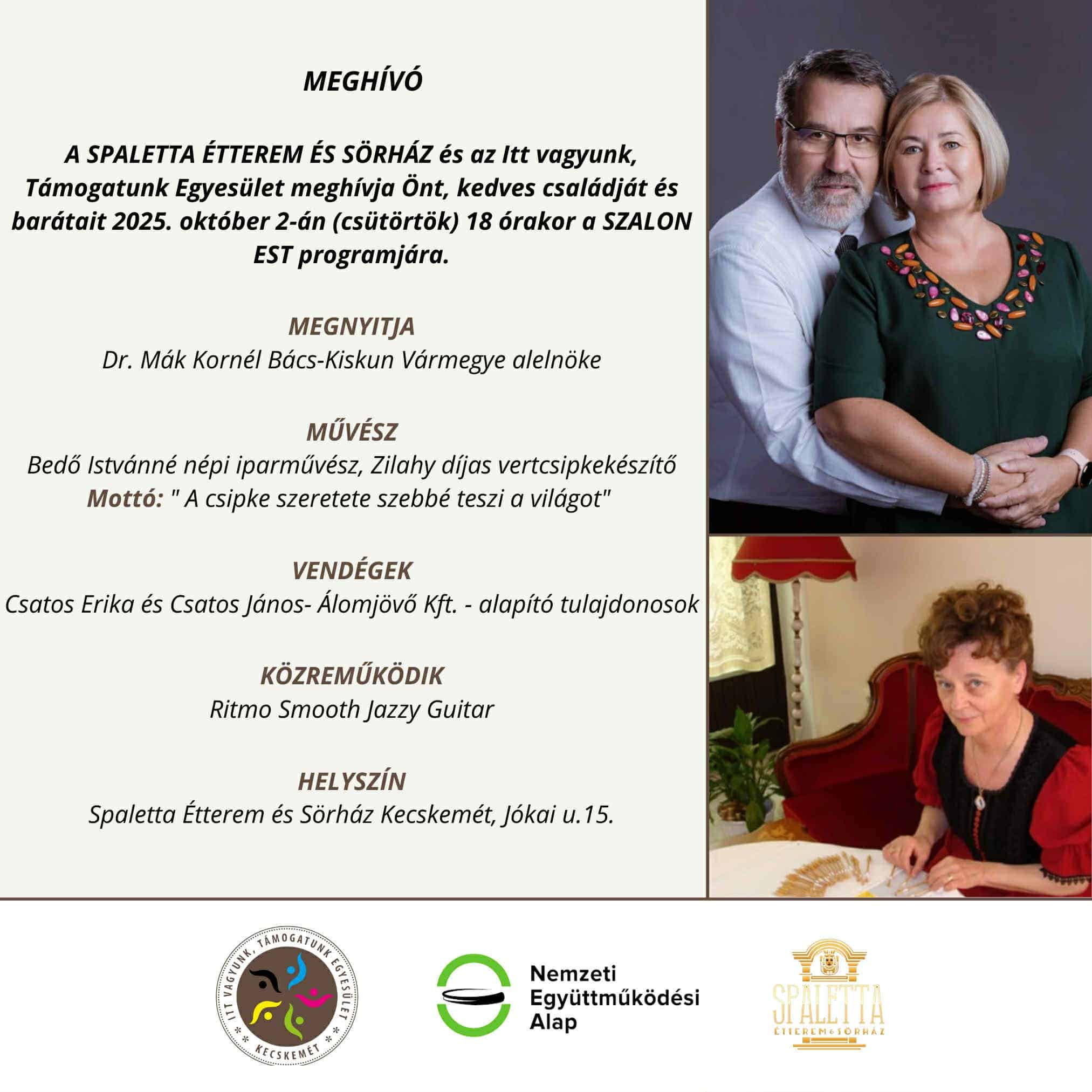 A Spaletta Étterem és Sörház, valamint az Itt vagyunk, Támogatunk Egyesület újabb szalonestjén az álomjövő és a csipkébe vert valóság találkozik egybe. Az est vendégei ugyanis Csatos Erika és Csatos János, az Álomjövő Kft. alapítói, valamint Bedő Istvánné Zilahy-díjas vertcsipke-készítő népi iparművész lesznek.