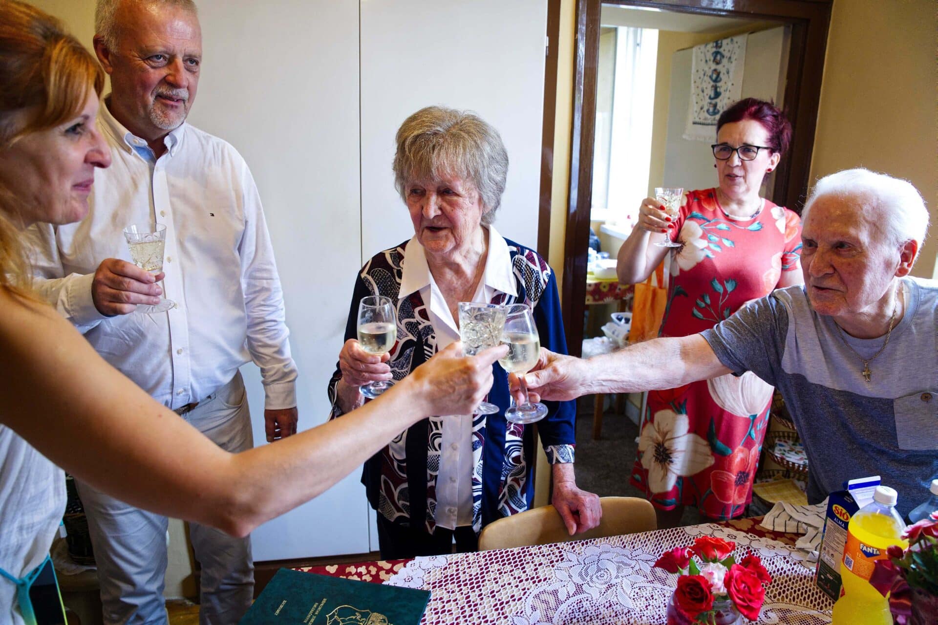 A köszöntőn együtt ünnepelt vele 96 éves férje, Szlávik József és három lányuk közül Anikó, aki minden nap meglátogatja szüleit, hiszen tőlük nem messze, a Kormányablakban dolgozik. A három lány 6 unokával ajándékozta meg a mai napig aktív Szlávik házaspárt, akik november 5-én ünneplik házasságuk 70. évfordulóját. Kilenc dédunokájuk közül ketten Franciaországban élnek – mesélte Marika néni, amikor családjáról kérdeztük.