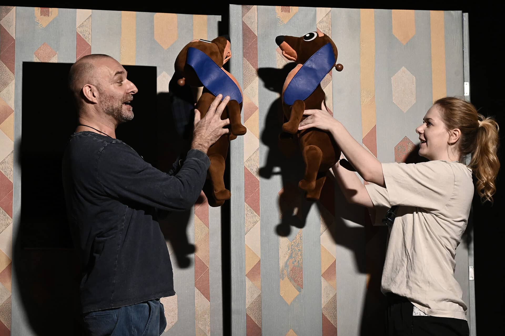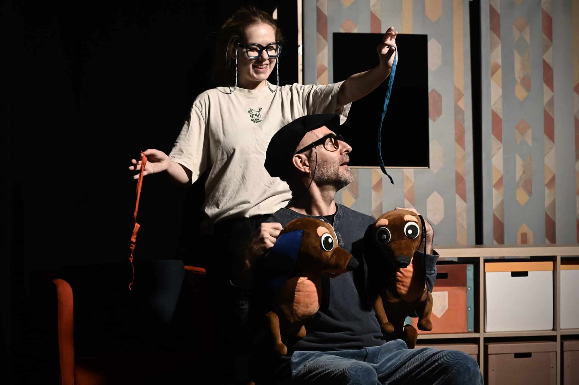 – Wunder Judit tervezte a darab látványvilágát, az ő érdeme a díszlet retró hangulata. Ritkaság egy színházban, de ezúttal bútorboltokból szereztük be a színes foteleket, szekrényt, mert épp erre az enteriőrre volt szükség a darab látványvilágához. Segíti a játékot egy forgatható paraván, ami háttérként szolgál az előadásban. A retró tapétás oldalát képek díszítik, a másik oldala pedig éjszakai hátteret képez ahhoz a részhez, amikor a kutyusok világgá mennek. Bertalan és Barnabás bábja egyébként nagyobb, mint az igazi tacskók. Érdekességük, hogy a kaptak egy pici jelzést, amit csak a színészek tudnak. Így ők – ellentétben Boldizsár bácsival és Borbála nénivel – nem keverik össze őket. Figyelnek arra, hogy ki kicsoda, ezzel is megadják számukra a kellő tiszteletet.