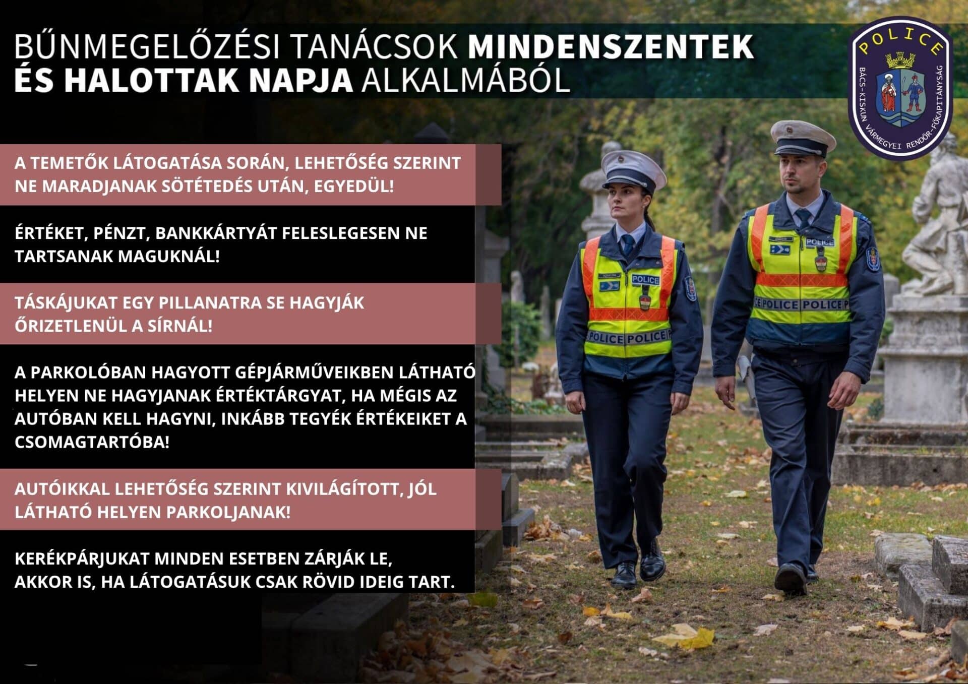 Bűnmegelőzési Tanácsok Mindenszentek és Halottak Napja alkalmábólKÖZLEMÉNY2025. 10. 26., 16:40A Bács-Kiskun Vármegyei Rendőr-főkapitányság Bűnmegelőzési Osztálya nevében fontos és hasznosítható megelőzési tanácsokat kapunk. #Bács-Kiskun Vármegyei Rendőr-főkapitányság #biztonság #Halottak napja #Mindenszentek #temető
