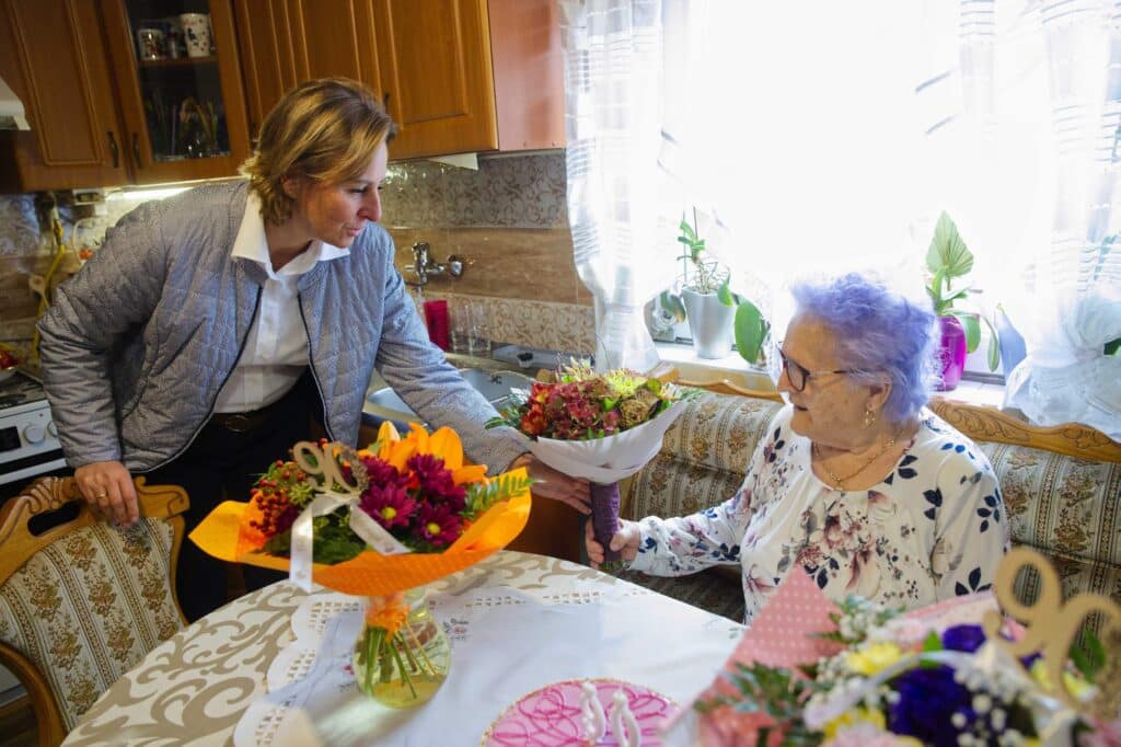 90. születésnapján köszöntötte fel ma délelőtt Domonyi Györgynét Szemereyné Dr. Pataki Klaudia polgármester, valamint Jánosi István önkormányzati képviselő. A szépkorú asszony ma is jó egészségnek örvend, hetente több alkalommal főz is a családnak, specialitása a paradicsomos húsgombóc, valamint a meggyes zserbó.