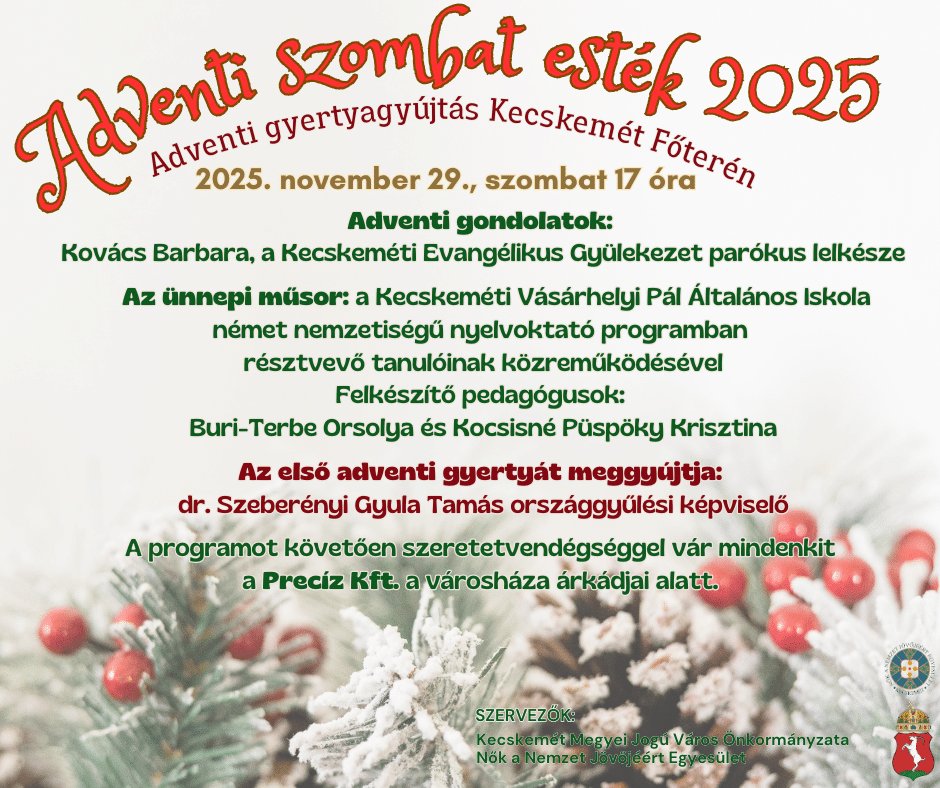 November 29-én, szombaton vette kezdetét a Kecskeméti Advent programsorozata a főtéren, ahol közös gyertyagyújtással, rövid ünnepi műsorral és szeretetvendégséggel indult az adventi időszak. A megnyitón Juhász Gyula Karácsony felé című verséből hangzott el részlet, majd a szervezők köszöntötték a résztvevőket advent első vasárnapjához közeledve.