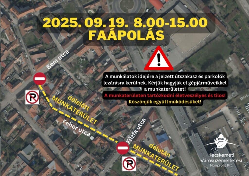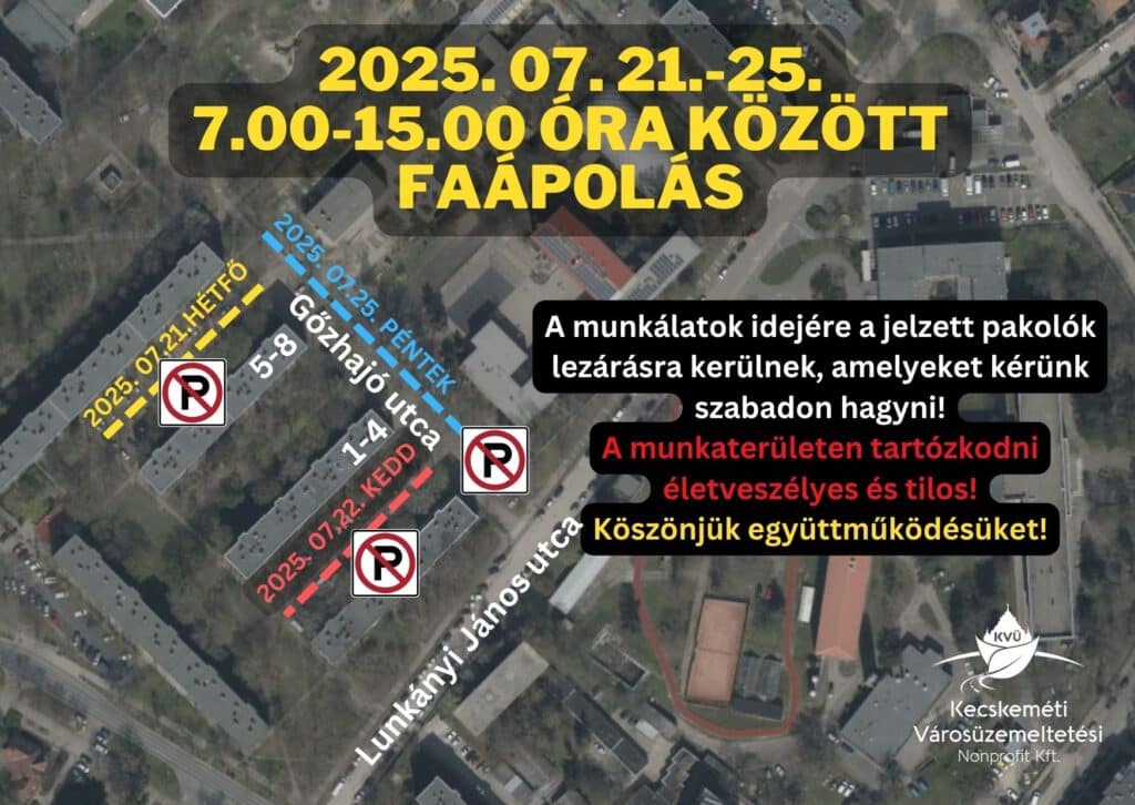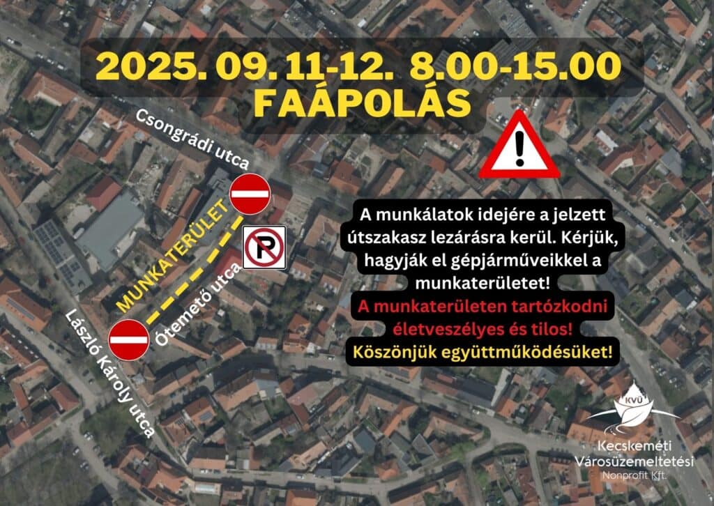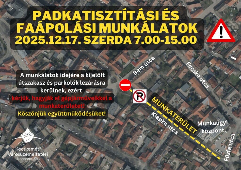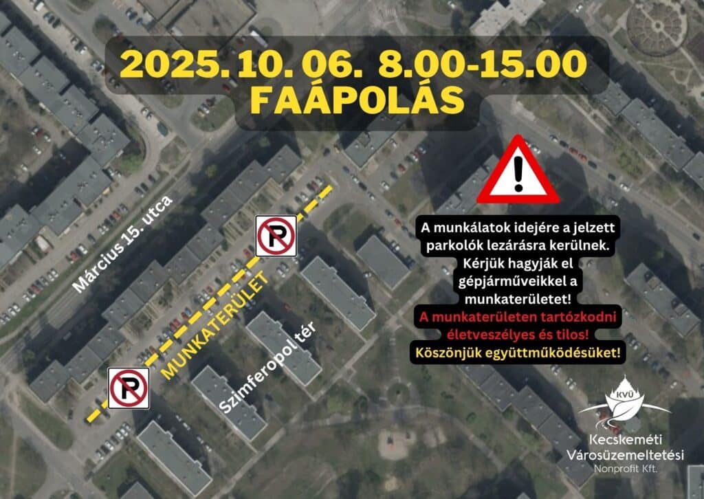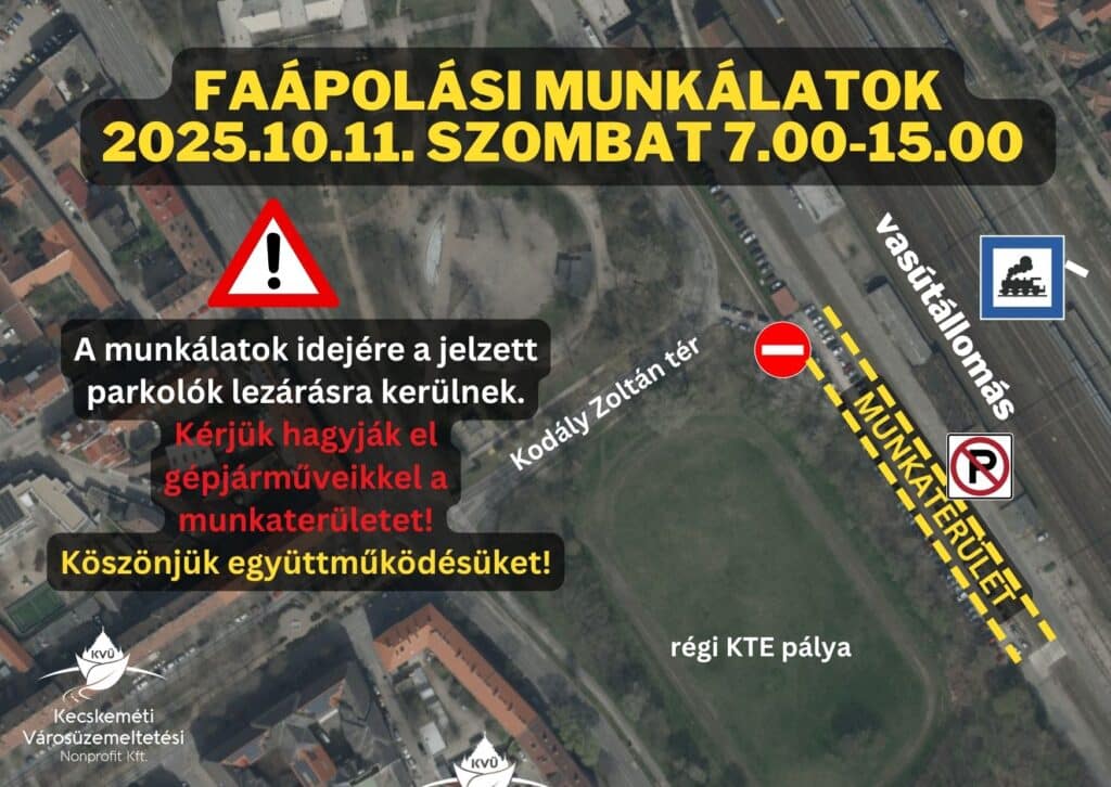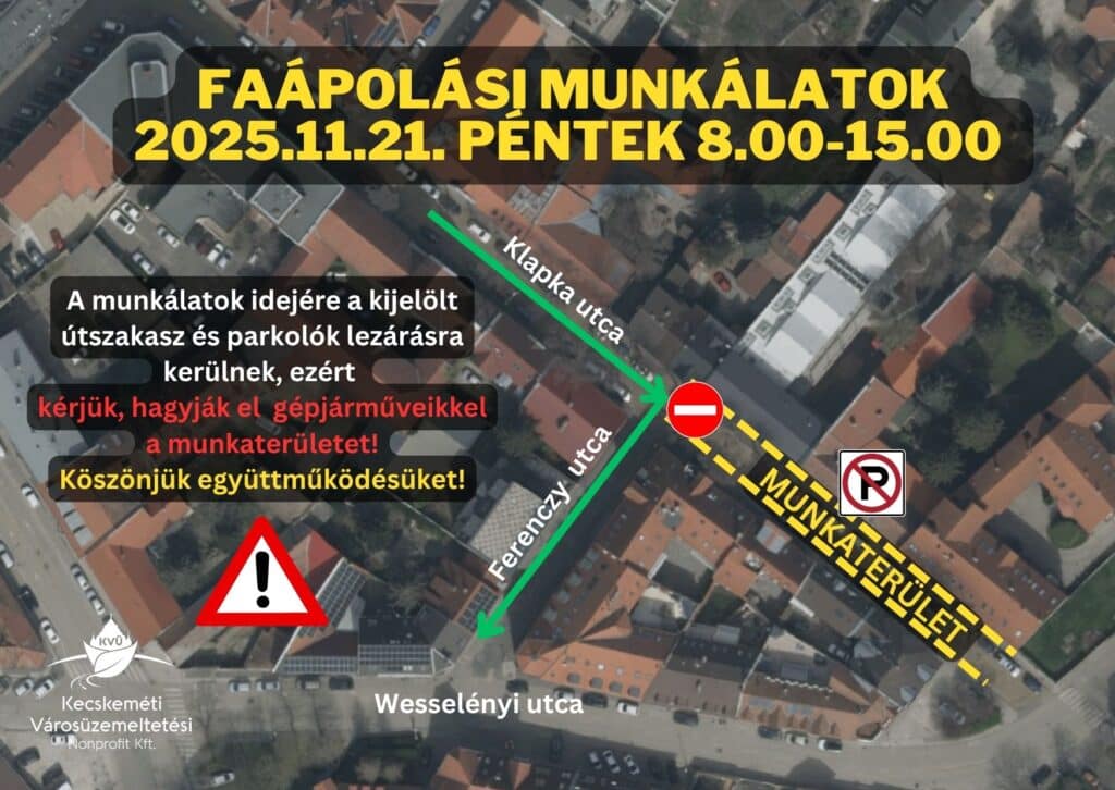 Faápolási munkák miatt 2025. november 17-én hétfőn 6.00-16.00 óra között „megállni tilos” lesz érvényben a Bagi László utca 1-7. és a Batthyány utca 19-23. társasházak által határolt parkolóban, amelynek betartását a Kecskeméti Városrendészet ellenőrzi.