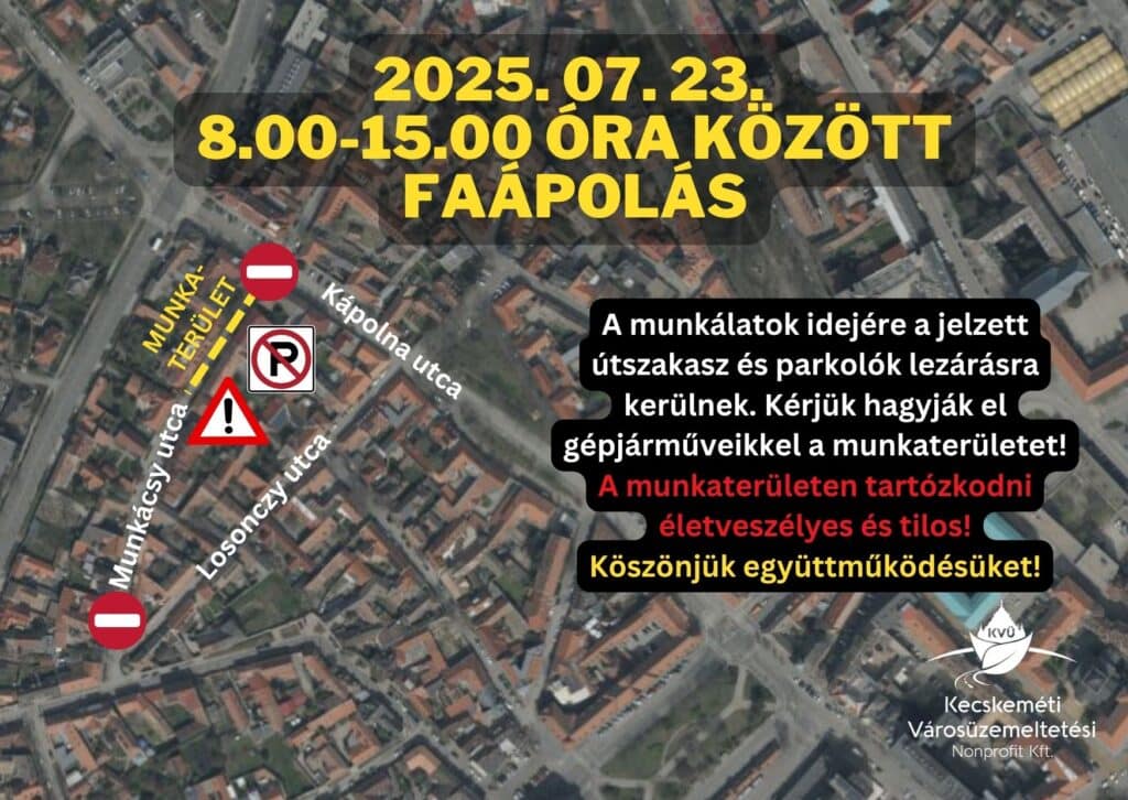 A Kecskeméti Városüzemeltetési Kft. tájékoztatása szerint július 23-án faápolási munka zajlik majd a Munkácsy utca környékén. Részletek az alábbi tájékoztatóban.