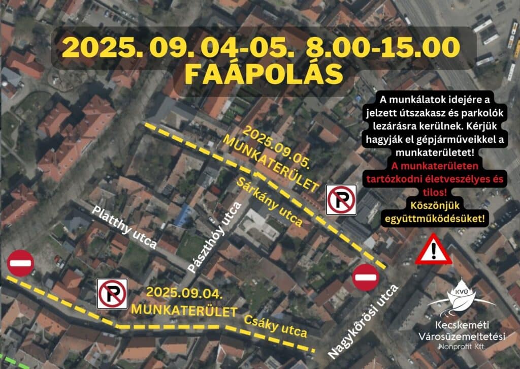 Szeptember 4-én csütörtökön a Csáky utcában, szeptember 5-én pénteken a Sárkány utcában végeznek faápolási munkálatokat 8.00 és 15.00 óra között. A feladatvégzés idejére a jelzett utcákat lezárják.