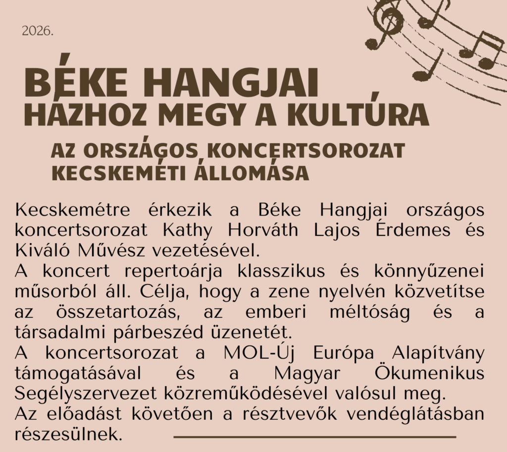 Kecskemétre érkezik a Béke Hangjai országos koncertsorozat Kathy Horváth Lajos Érdemes és Kiváló Művész vezetésével. A koncert repertoárja klasszikus és könnyűzenei műsorból áll. Célja, hogy a zene nyelvén közvetítse az összetartozás, az emberi méltóság és a társadalmi párbeszéd üzenetét.