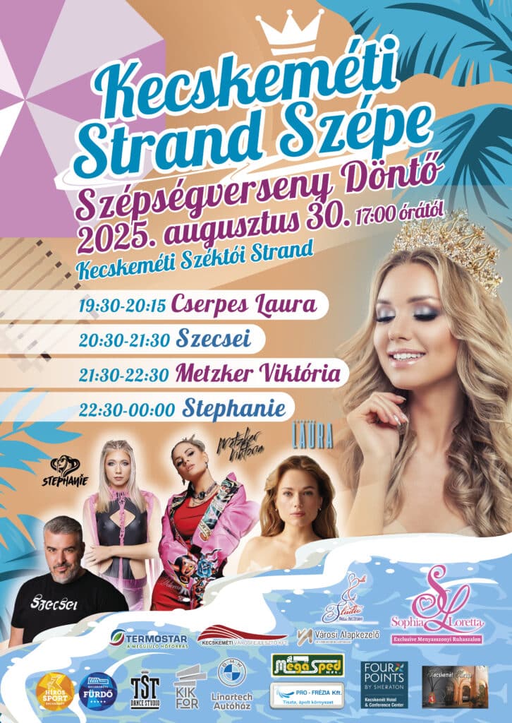Augusztus 30-án, szombaton igazi nyárzáró show-val vár minden érdeklődőt a Kecskeméti Strand Szépe 2025 döntője, a Széktói Strandon! A látványos programokkal és sztárfellépőkkel tarkított rendezvény 17:00 órakor veszi kezdetét – és garantáltan felejthetetlen élményt kínál a divat, a szépség és a zene szerelmeseinek.