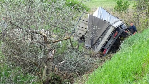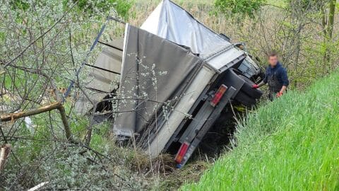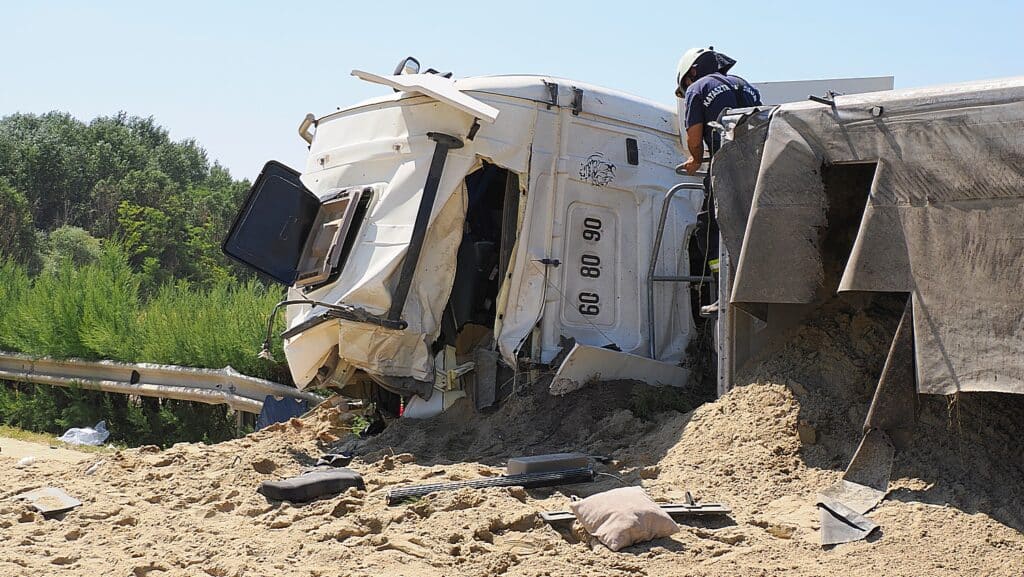 A sofőrt feszítővágóval szabadították ki, miután a belső szalagkorlátot letarolva felborult egy húsz tonna homokot szállító kamion az M5-ös autópályán Kiskunfélegyháza közelében, az 5302-es útra vezető lehajtónál.
