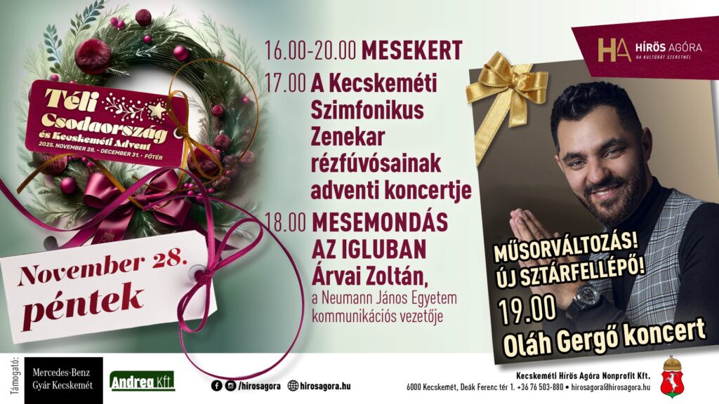 Betegség miatt a mai koncerten Radics Gigi helyett Oláh Gergő lesz a sztárfellépő a pénteki Kecskeméti Adventen – adta hírül a Hírös Agóra. Mutatjuk a további adventi programokat.