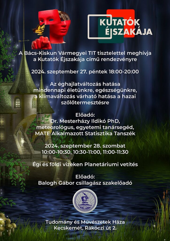 A Bács-Kiskun Vármegyei TIT kétnapos rendezvénynek ad otthont a Kutatók Éjszakája alkalmából a Tudomány és Művészetek Házában. A részletekről lent olvashatnak.