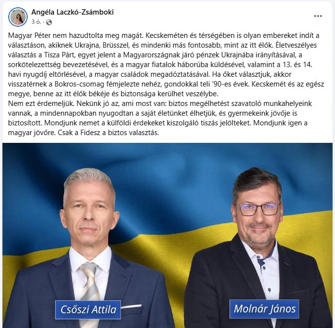 "Magyar Péter nem hazudtolta meg magát. Kecskeméten és térségében is olyan embereket indít a választáson, akiknek Ukrajna, Brüsszel, és mindenki más fontosabb, mint az itt élők." - írja posztjában Laczkó Zsámboki Angéla.