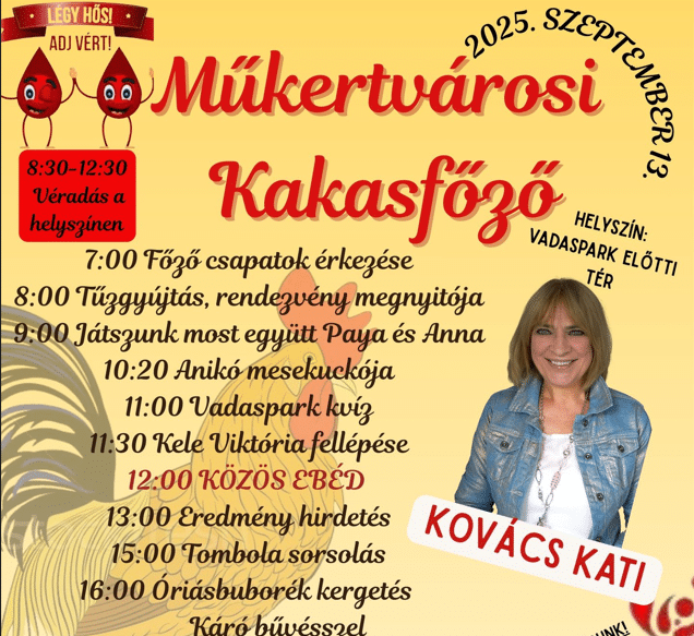 Ismét begyújtanak a bográcsok alá Műkertvárosban most szombaton. Közös ebéddel összekötött kakasfőzést rendez a Műkertvárosért Egyesület a Vadaspark előtti téren. A rendezvény sztárvendége Kovács Kati énekesnő lesz. Az esemény másik kiemelt része pedig a véradás lesz.