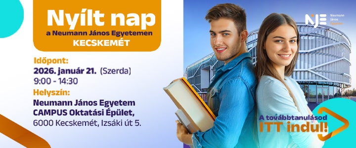 November 14-én ismét nyílt napra várja az érdeklődőket a Neumann János Egyetem. A rendezvényen az érdeklődők megismerhetik mindhárom kar képzési portfólióját, találkozhatnak a hallgatói csapatokkal, oktatókkal. Tájékoztatást kapnak a pontszámításról, a jelentkezési feltételekről és a duális képzés adta lehetőségekről. Mutatjuk a részletes programot.