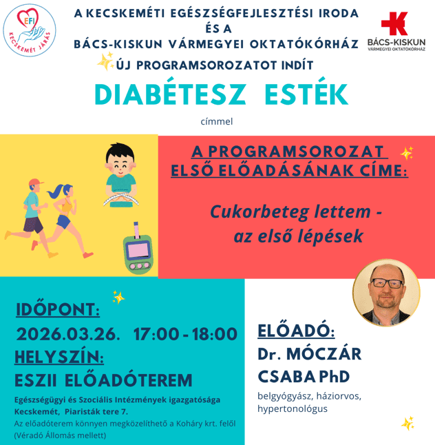A Kecskeméti Egészségfejlesztési Iroda és a Bács-Kiskun Vármegyei Oktatókórház szeretettel várja az érdeklődőket a Diabétesz Esték programsorozatának második előadására. Mutatjuk a részleteket.