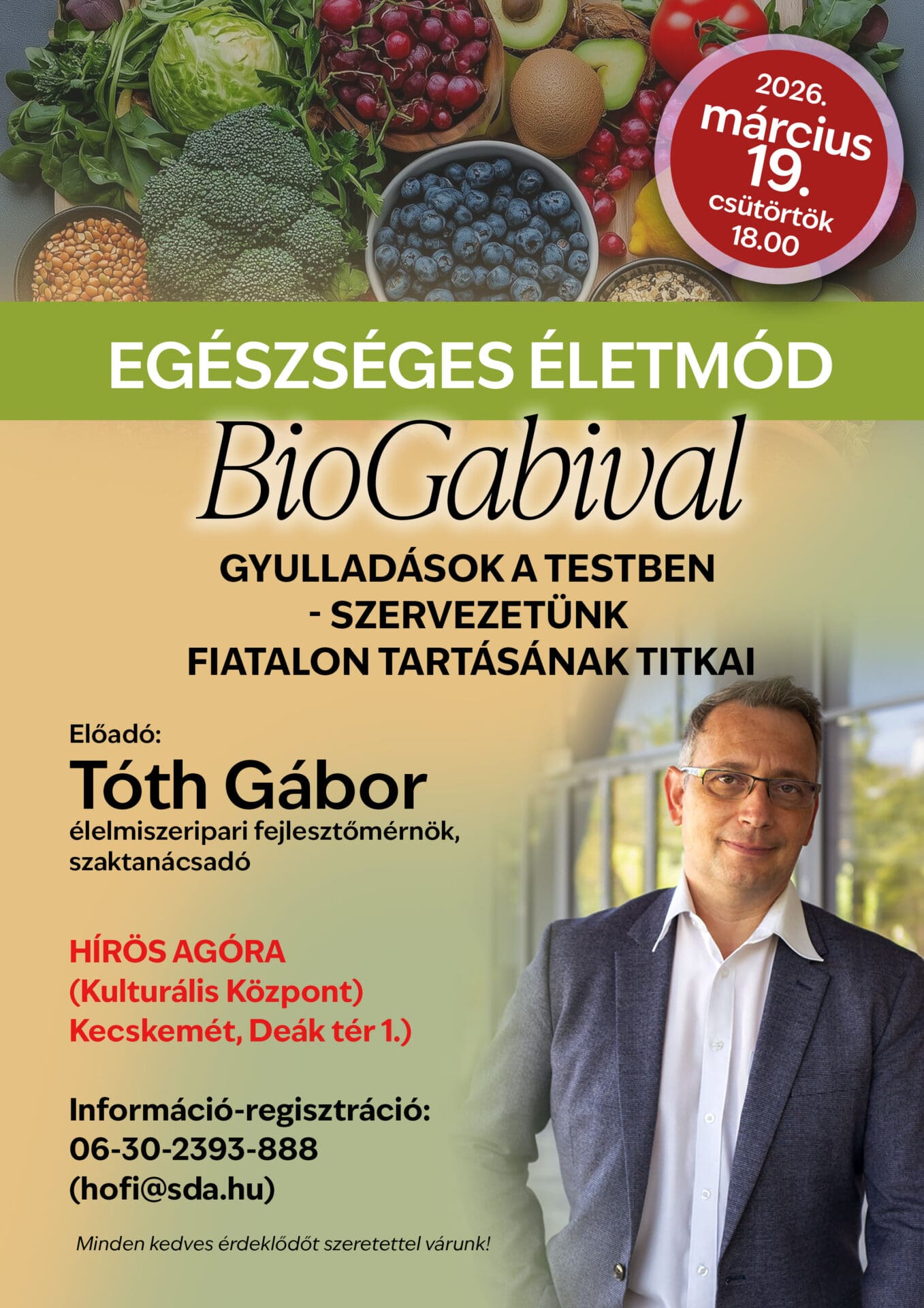 A Szigeti Jenő Szabadegyetem programsorozatának következő témája: Hogyan tartsuk fiatalon a testet és kerüljük el a betegségeket? A március 19-i előadás 18 órakor kezdődik a Hírös Agórában, az est házigazdája, Hoffer Zoltán Tóth Gábor élelmiszeripari fejlesztőmérnökkel beszélget.