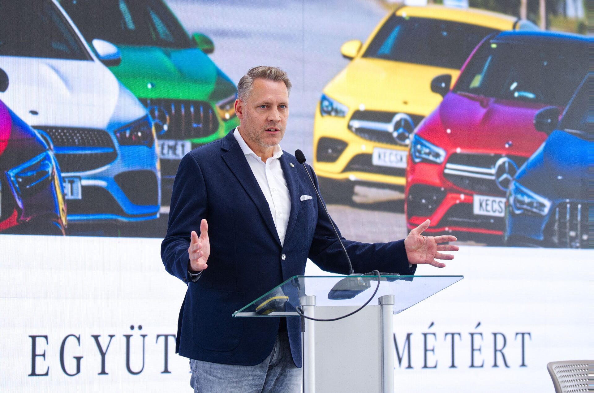 Ezt követően átadta a szót Jens Bühlernek a kecskeméti Mercedes gyár igazgatójának, aki azzal kezdte, hogy 4500 dolgozójuk évi 150 ezer autót gyárt. Ebből a tömegből sokan a városban telepedtek le. A folyamat nem állt le, mivel a következő években 3000 új munkatárssal bővül a kollégák csapata, közülük ezret jövőre vesznek fel. Hangsúlyozta, hogy tavaly készült el a 2 milliomodik Mercedes a gyárban, de mint mondta, a következő 2 millióra nem kell 15 évet várni. Óriási fejlesztéseket említett, egyebek mellett akkumulátorbeszerelő-üzem fog működni, illetve szólt arról is, hogy hamarosan olyan új modellt dobnak a piacra, amelyet itt gyártanak majd. Majd kiemelte: Kecskemét lesz a hazai autógyártás legnagyobb központja, illetve a Mercedes konszern hálózatán belül az itteni gyár lesz a legnagyobb.