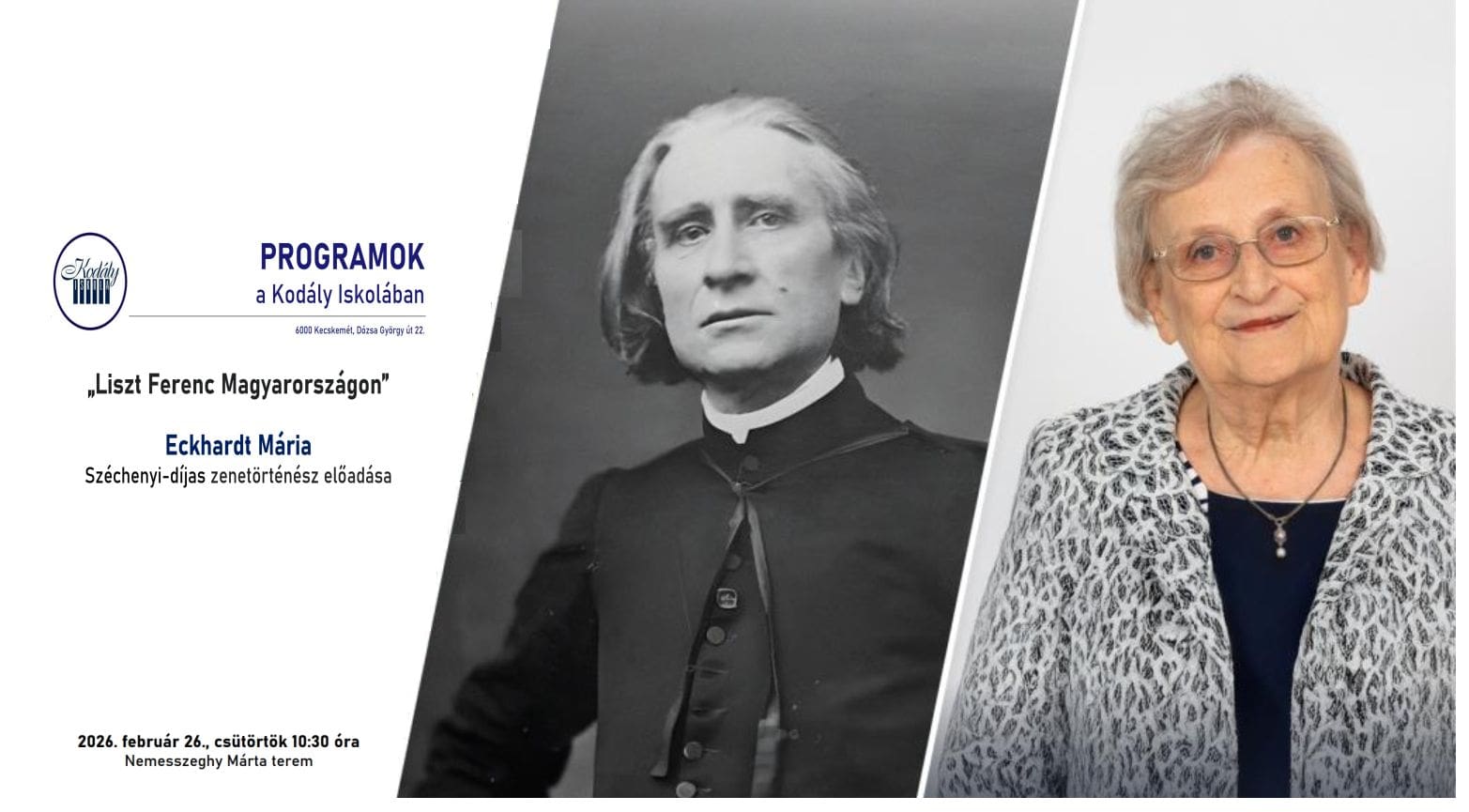 A világszerte ismert és tisztelt zeneszerző, zongoraművész, tanár, a budapesti Zeneakadémia egyik alapítója, elnöke, Liszt Ferenc magyar kötődéseiről, hazaszeretetéről a neves Liszt-kutató, a Liszt Ferenc Emlékmúzeum és Kutatóközpont alapítója, korábbi igazgatója, Eckhardt Mária osztja meg gondolatait február 26-án a Kodály Iskolában. Az érdeklődők a Széchenyi-díjas előadó révén számos értékes zenetörténeti információval gazdagodhatnak. Megtudhatják például, hogy 1840-ben Liszt hangversenyt adott a Pesti Magyar Színház javára, amelynek során a nemzet hálájaként díszkardot kapott hat magyar mágnástól, s hogy köszönőbeszédében egy fontos gondolatot fogalmazott meg: „A csatamezők minden dicsőségével felruházott Magyarország ebben az órában a művészet, az irodalom, a tudomány, a béke barátaitól vár új hírnevet.” De Liszt ugyanebben az évben nemcsak a Pesti Magyar Színházat támogatta – amely röviddel később fölvette a Nemzeti Színház nevet és hamarosan a 19. századi magyar színházi művelődés zászlóshajójává vált –, hanem koncertezett „Egy Pesten felállítandó nemzeti CONSERVATORIUM pénzalapja megkezdésére” is. A jótékonysági esten nem csupán zongorázott, hanem ez alkalommal lépett fel először nyilvánosan karmesterként: Mozart Varázsfuvolájának nyitányát dirigálta.