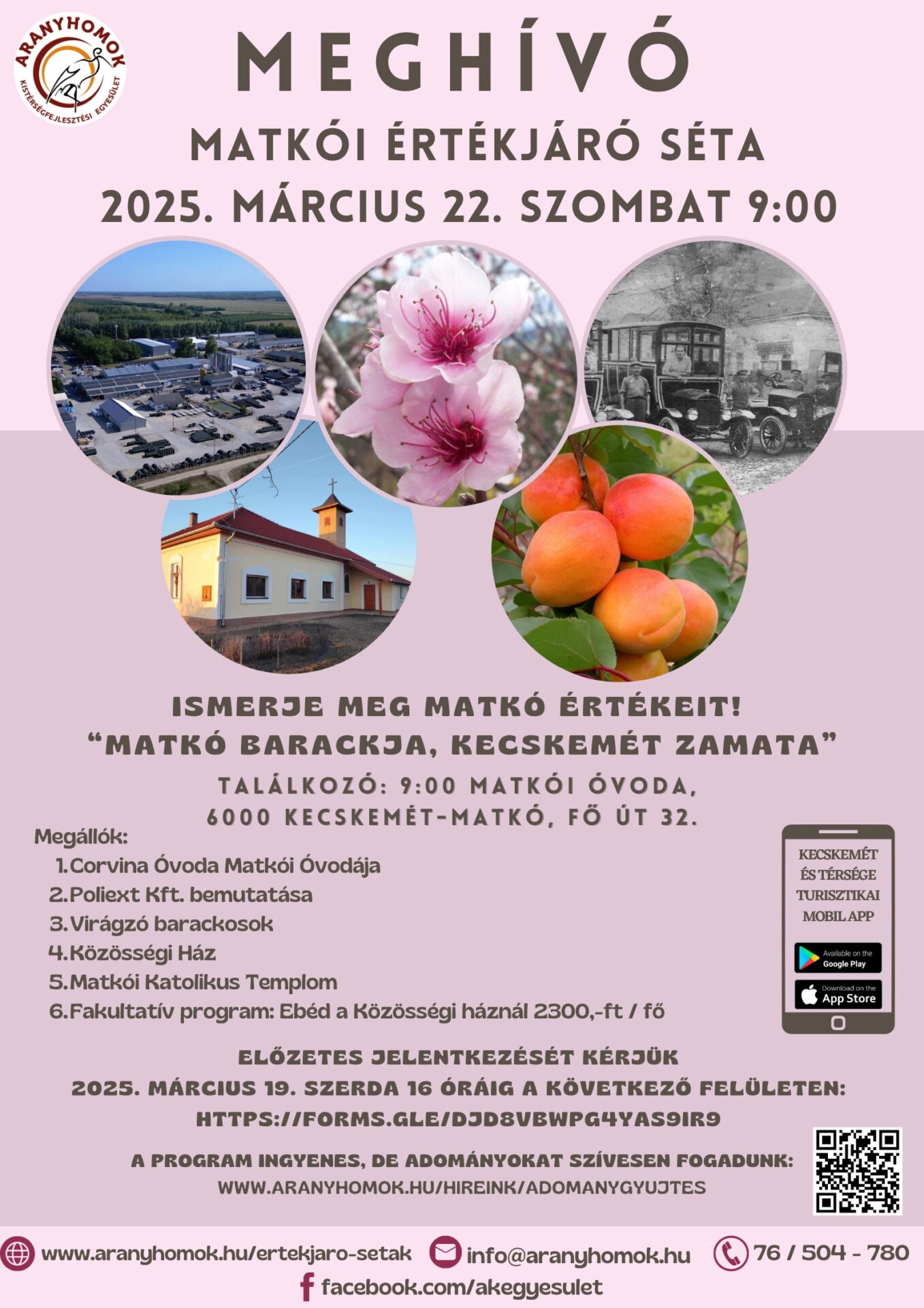 A programról részletesen tájékozódhat az Aranyhomok Egyesület Facebook oldalán is: https://www.facebook.com/akegyesulet vagy az egyesület honlapján www.aranyhomok.hu/ertekjaro-setak vagy a 76/504-780-as telefonszámon.