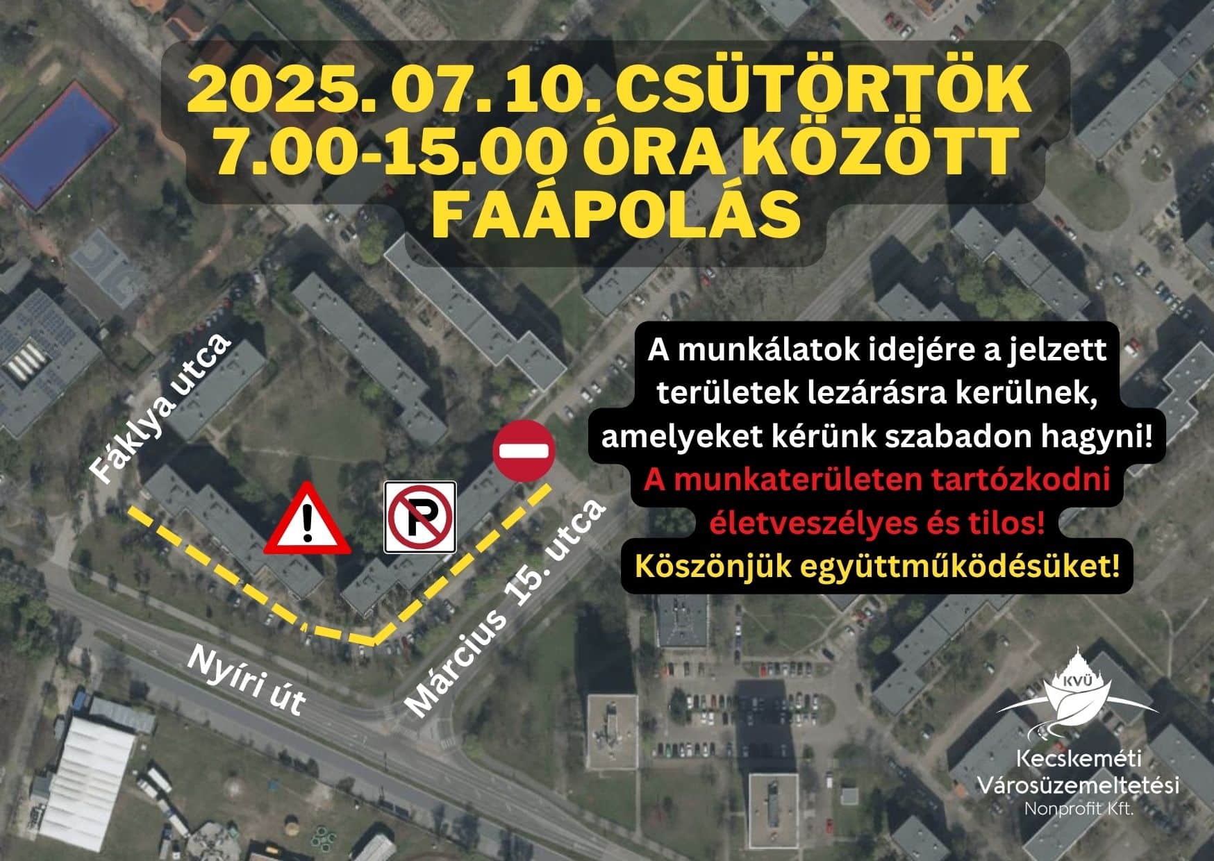 Csütörtökön 7.00 és 15.00 óra között faápolási munkálatokat végez a Március 15. utca 49-55. szám előtti parkolóban a Kecskeméti Városüzemeltetési Nonprofit Kft. Erre a néhány órára lezárják a helyszínt. A társaság azt kéri a kár- és balesetveszély elkerülése érdekében az itt lakóktól, az itt parkolóktól, hogy hagyják el járművekkel a munkaterületet, amely megközelítése munkavégzés közben életveszélyes és tilos. A Kft. előre is köszöni az itt élők türelmét, a munkák elvégzése fontos az itt élők biztonsága érdekében.