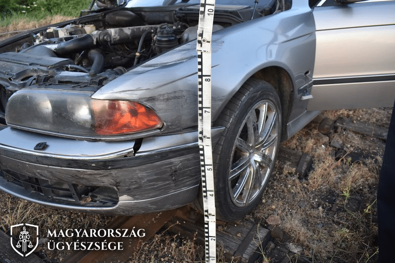 A rendőrség által a helyszíni szemle során készített képeken a vasúti síneken elakadt autó és az autón keletkezett sérülések láthatók.