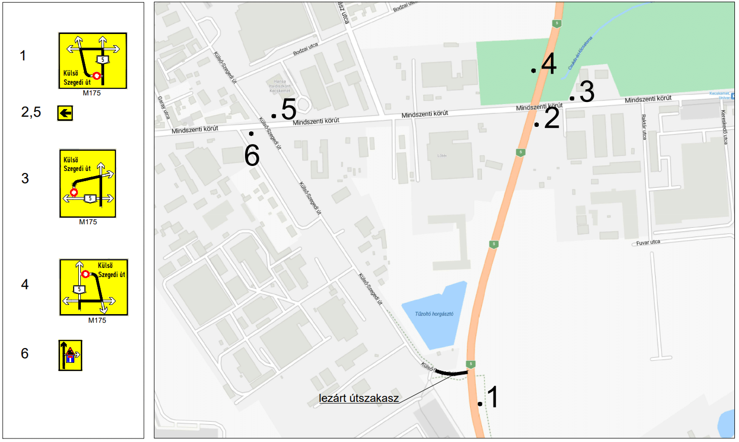 Terelőút változatlanul a Mindszenti krt. - 5. sz. főút kereszteződés igénybevételével biztosított.