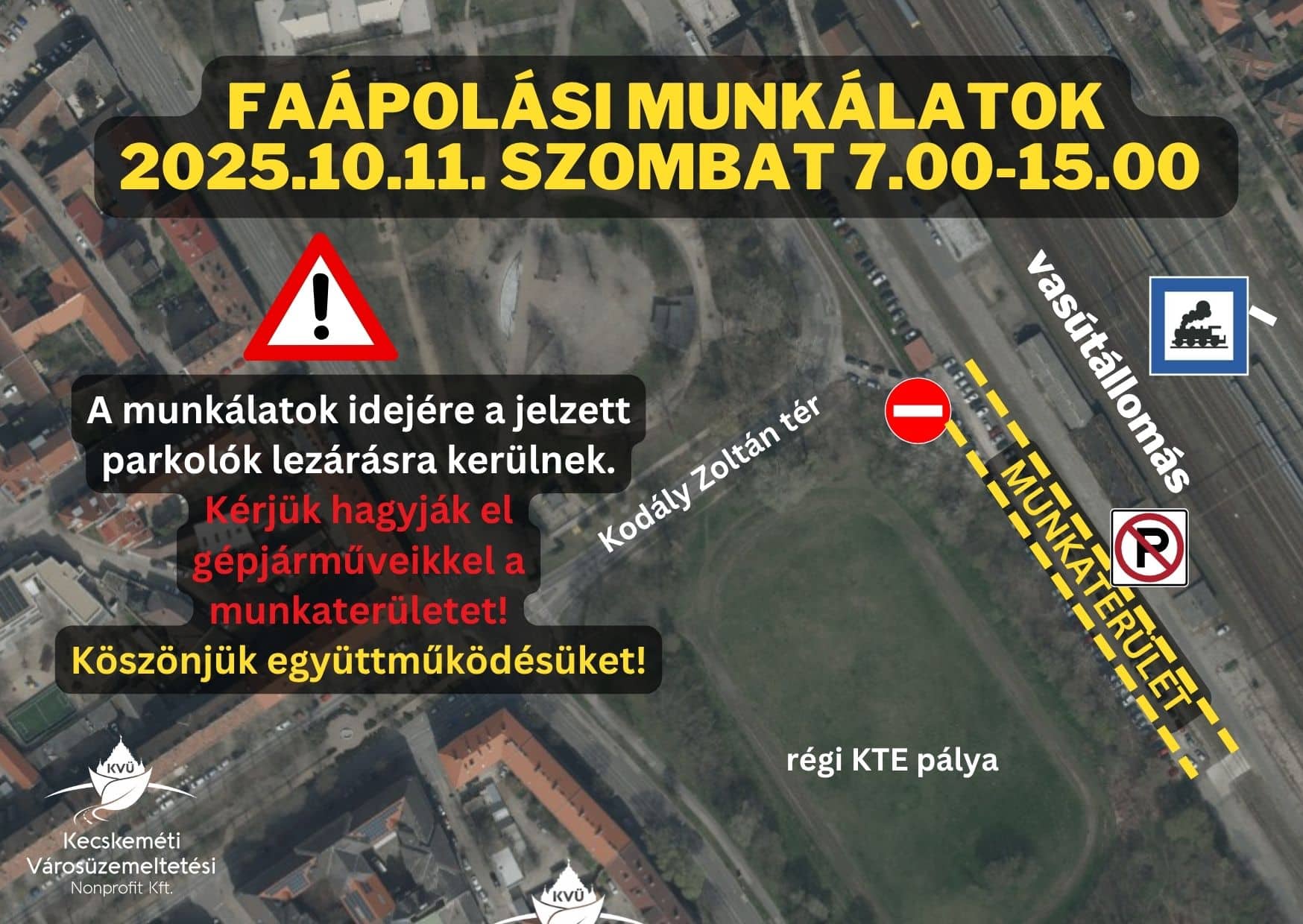 2025. október 11-én szombaton a hajnali óráktól délután 15.00 óráig lezárják a Kodály Zoltán téren a vasútállomás és a régi KTE pálya között elhelyezkedő parkolót faápolási munkálatok miatt. Az elsődleges kár- és balesetveszély elhárítása érdekében, kérik, szíveskedjenek gépjárműveikkel elhagyni a helyszínt a feladatvégzés idejére, lehetőleg legkésőbb péntek estig.