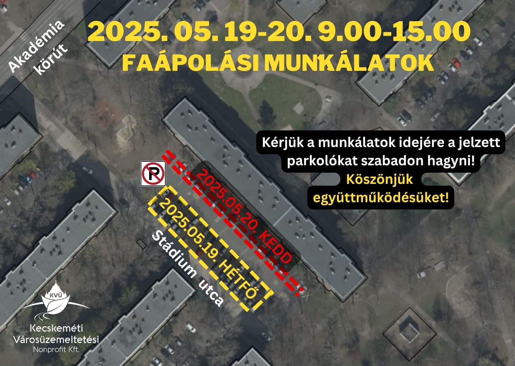 Ezúton hívjuk fel a Stádium utcai lakosok figyelmét, hogy 2025. május 19-én és 20-án 9.00 és 15.00 óra között faápolási munkát végzünk. Hétfőn a középső parkolókat, kedden a Stádium utca 13-17. számú háztömb előtti parkolókat zárjuk le. Kérjük szíveskedjenek a kijelölt területeket a munkálatok idejére szabadon hagyni. Együttműködésüket köszönjük!