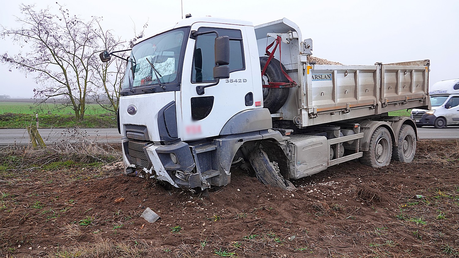 Gépkocsi ütközött kavicsot szállító teherautóval