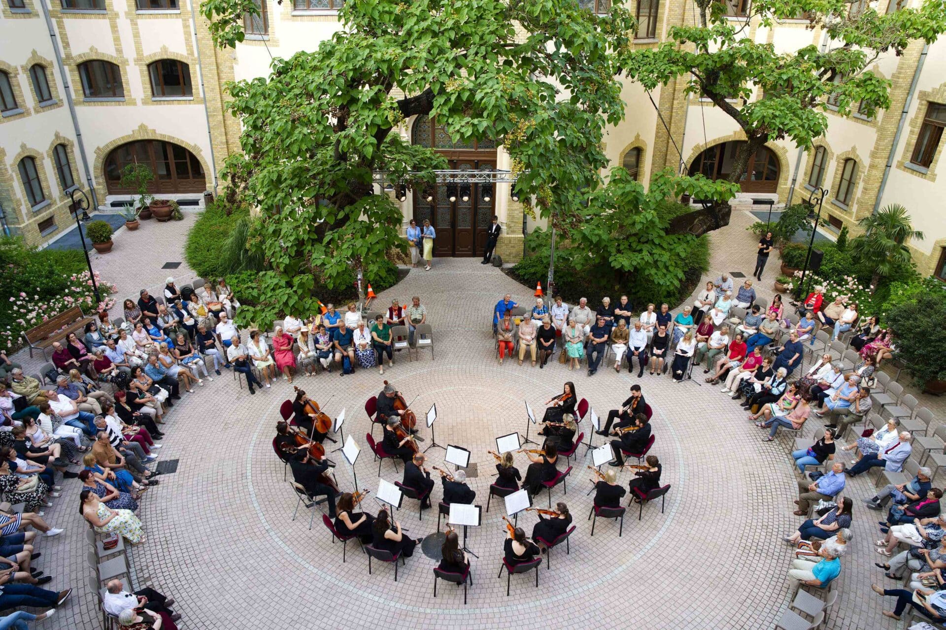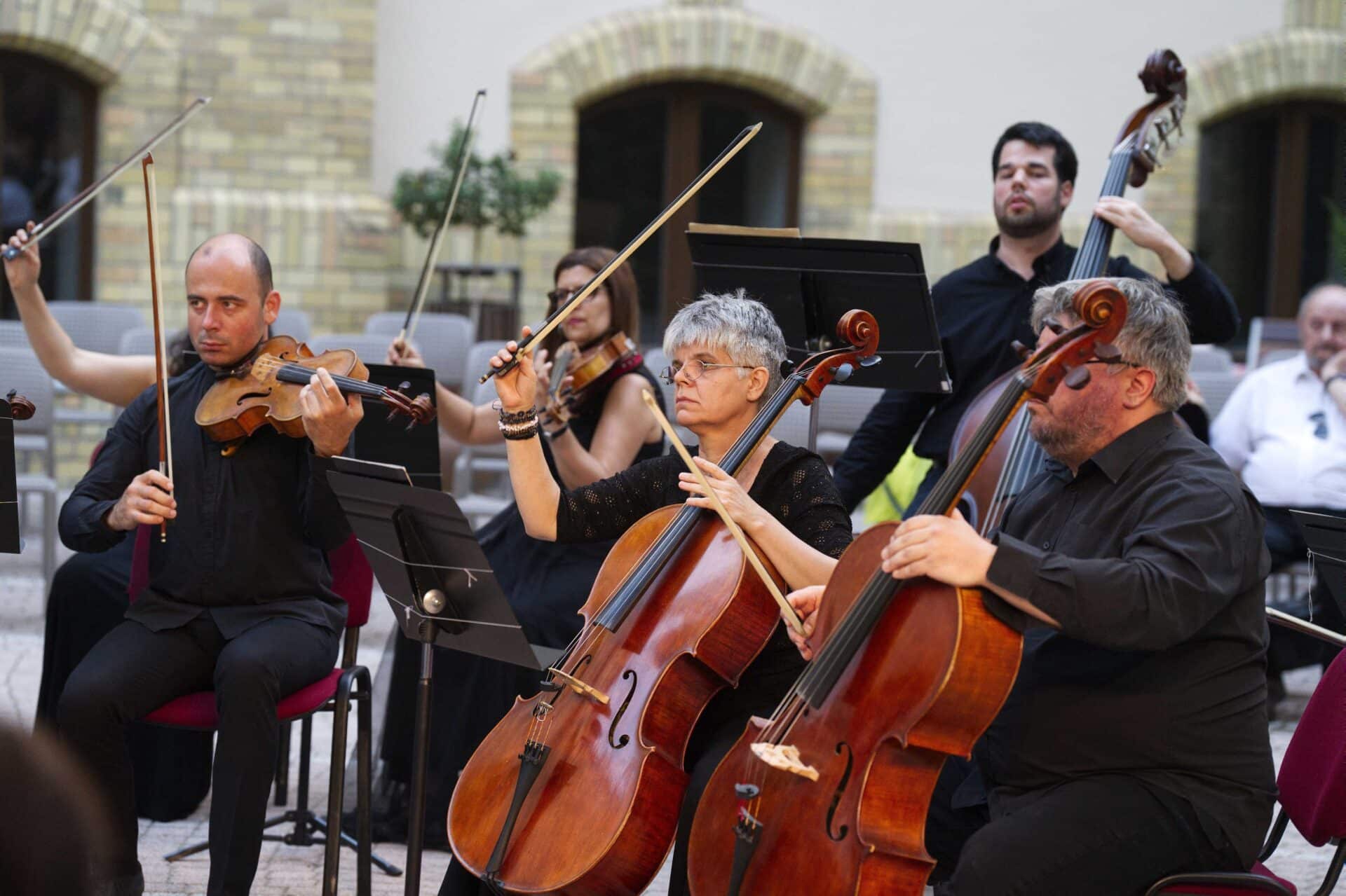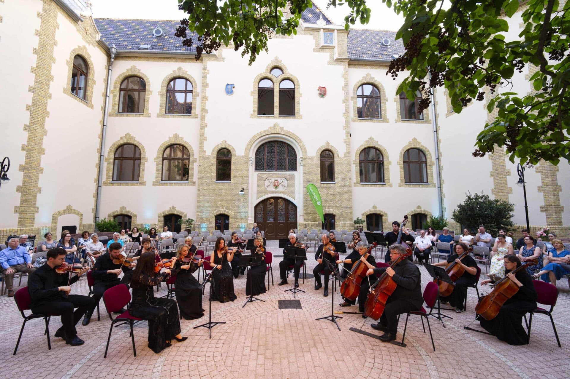 A Nyitott Városháza programsorozat utolsó rendezvénye szokatlan módon kezdődött. A „tündérpalota” névvel is illetett épület hangulatos udvarán gyülekező zeneszeretők egy része rövid ideig észre se vette, hogy a tágra nyitott második emeleti ablakokból zene szűrődik ki: a Kis éji zene, Mozart talán legismertebb és legnépszerűbb művének első taktusai. Pár másodperc elteltével azután a gyönyörű muzsika összemosódott a nézők tapsával, amely a Kecskeméti Szimfonikus Zenekar vonósait köszöntötte, akik elfoglalták a helyüket a csodás tér közepére kihelyezett székeken. A markáns, jókedvű, fanfárszerű dallam visszatérését pedig az együttes már átvette az emeleti hangszóróktól, az első tétel folytatását „élőben” hallhatták a jelenlévők, akik ezúttal a zenészekkel nemcsak szemben, hanem őket szinte körülölelve ültek.