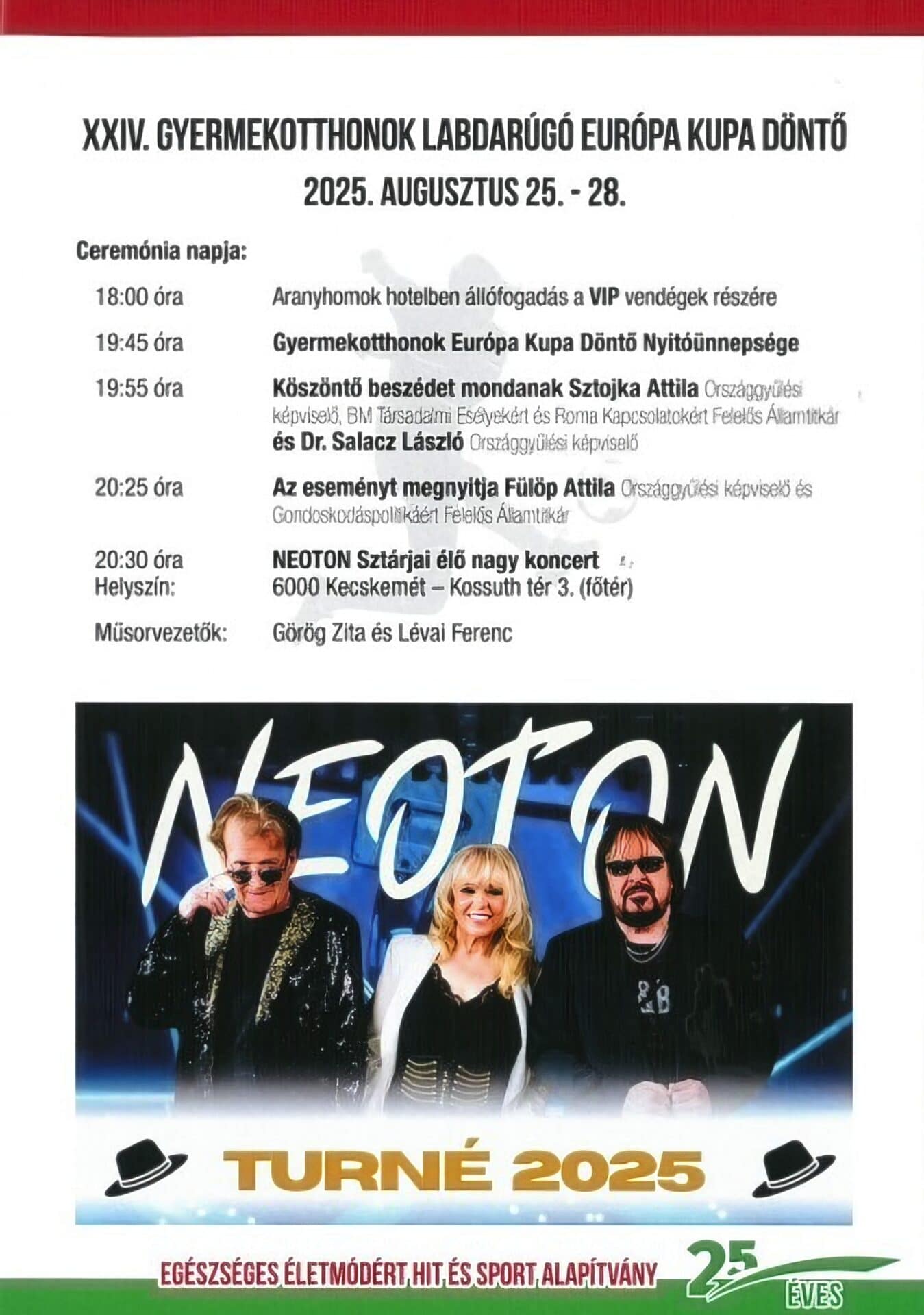 A Mercedes-Benz Gyár színpadon 19.45-kor kezdődik a Gyermekotthonok Európa Kupa Döntő Nyitóünnepsége. Ezt követően 19.55 -kor köszöntő beszédet mondanak Sztojka Attila országgyűlési képviselő, BM Társadalmi Esélyekért és Roma Kapcsolatokért Felelős Államtitkár és Dr. Salacz László országgyűlési képviselő. Majd 20.25 -kor az eseményt megnyitja Fülöp Attila Országgyűlési képviselő és Gondoskodáspolitikáért Felelős Államtitkár. A rendezvény 20.30 -kor a NEOTON Sztárjai élő nagy koncertjével folytatódik, műsorvezetők: Görög Zita és Lévai Ferenc