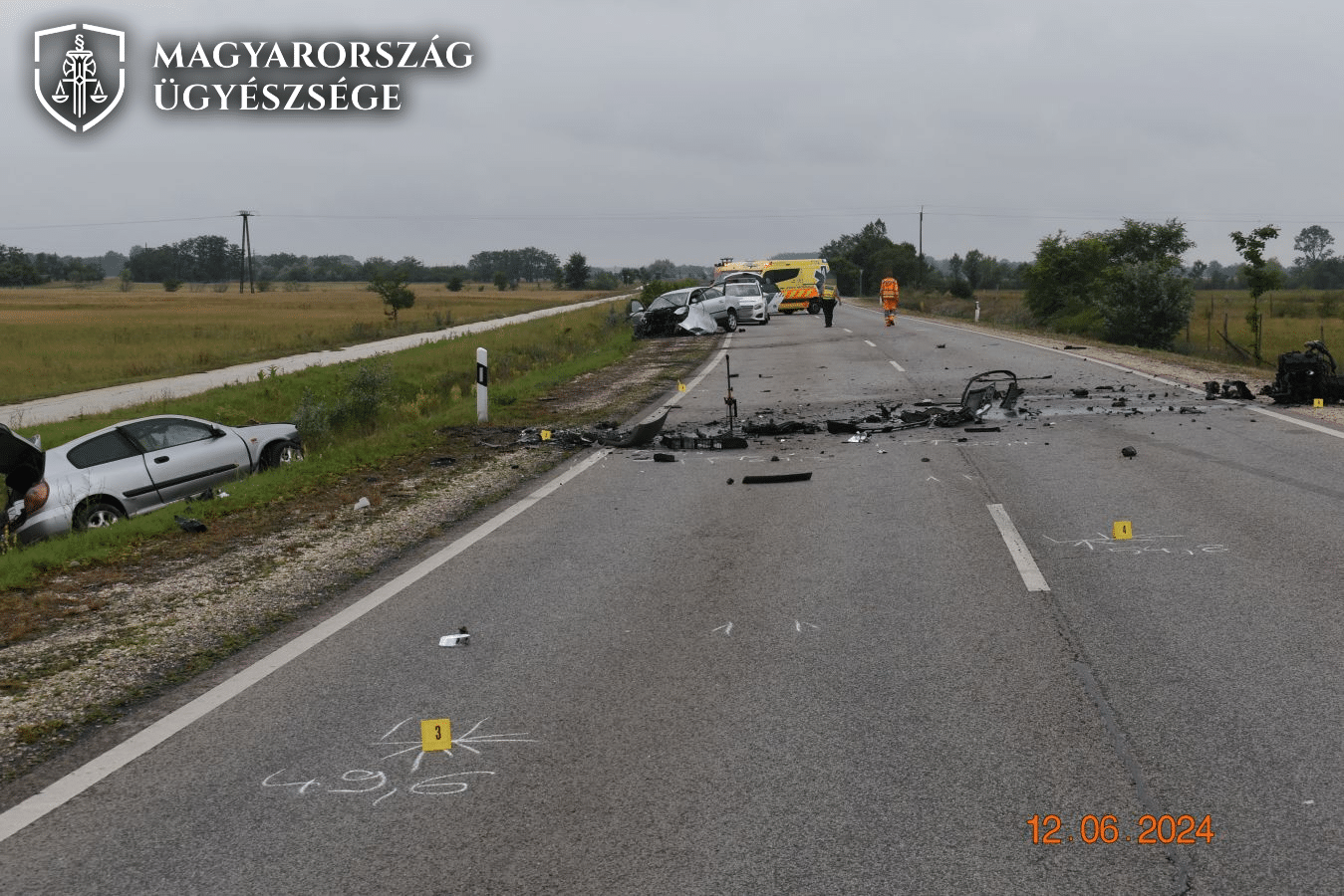 (A rendőrség által a helyszíni szemle során készített képen a baleset helyszíne és a sérült autók láthatók.)