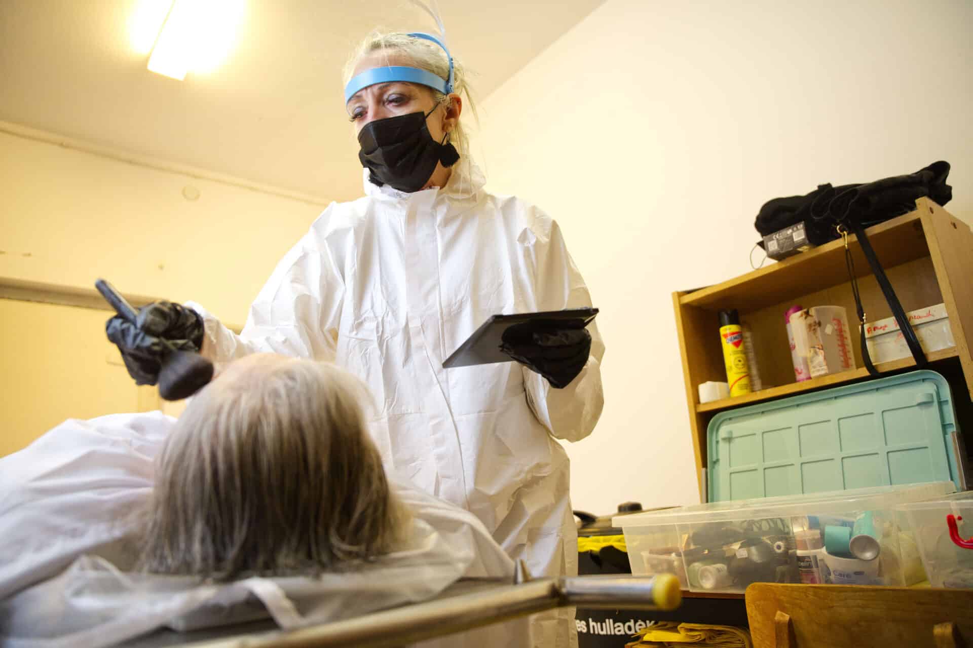 – Most következik a szem kiemelése – magyarázza, és nagyon szolidan festéket visz fel a halott szemhéjjára. – Ezután szoktam zárni a szájat, ha szükséges. Ilyenkor szakszerűen, tűvel, cérnával kell öszevarrnom. Igény szerint ezt követheti hajmosás, hajsütés, esetleg festés. Ha kihullott az elhunyt haja, akkor pedig parókát rendelünk.