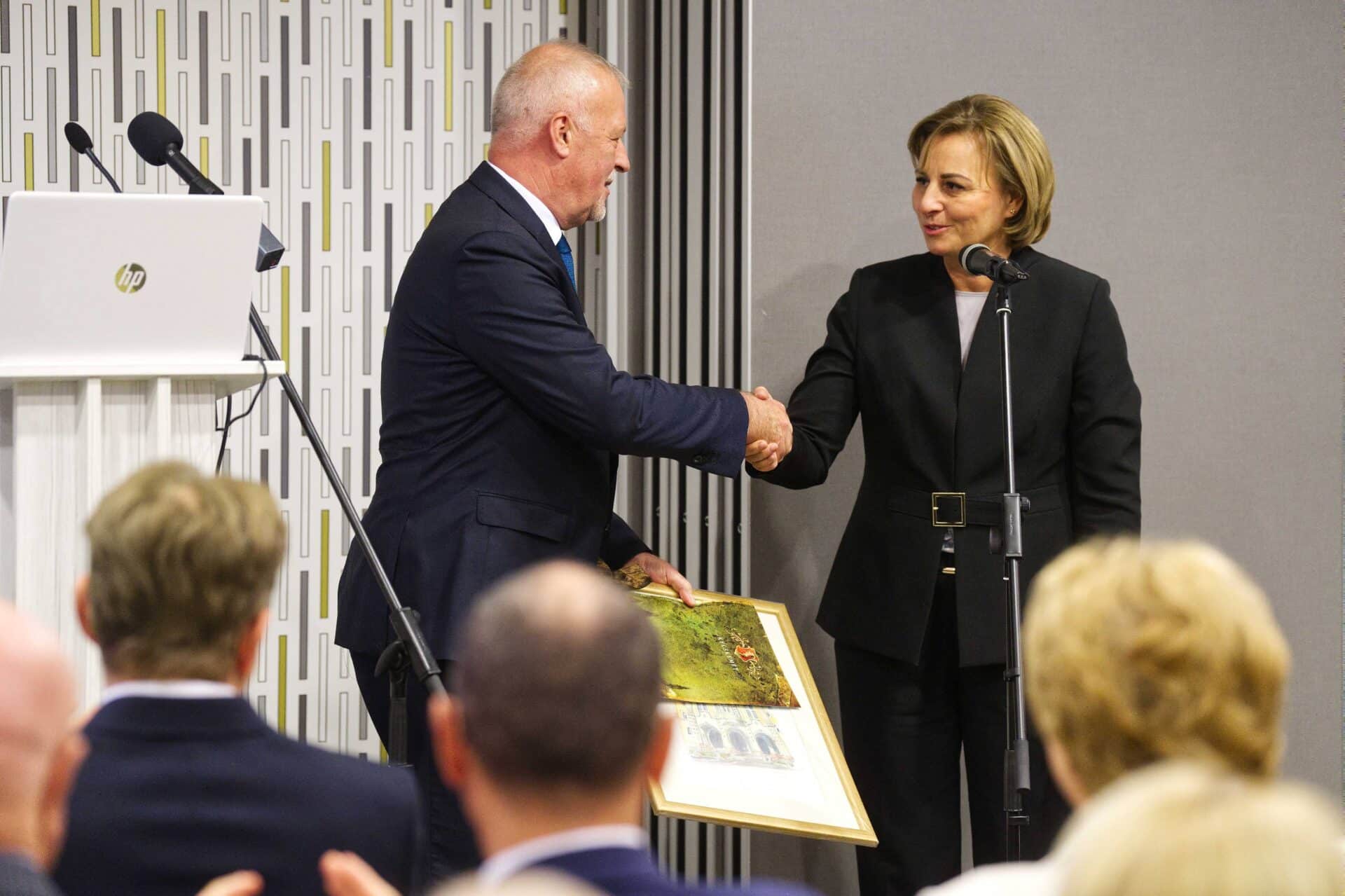 Ezt követően átadta a szót Csongovai Tamásnak, aki a szervezet első elnökeként az elindulás időszakát idézte fel. Majd pedig Szemereyné Dr. Pataki Klaudia, Kecskemét polgármestere méltatta a kamara tevékenységét. Hangsúlyozta, hogy erős kapcsolatok kötik a várost a kamarához. Maga a szervezet vezetője több mint tíz éve részt vesz Kecskemét vezetésében. A kamara is szerepet játszott abban, hogy ez a térség gazdasági területen szinte kilőtt az utóbbi években. A városnak, a térségnek és a vármegyének komoly gazdasági ereje van. A világ szinte minden pontján Kecskemétet nem csak Kodályról, a barackpálinkáról, hanem gazdasági erejéről is ismerik. Természetesen a betelepült nagy gazdasági partnerek is fontos szerepet játszottak Kecskemét jó megítélésében. Ha azonban nincs meg az az alap, amire lehet építkezni, akkor ezeket az eredményeket nem tudtuk volna elérni, mondta a város vezetője. Ezután egy helyi művész alkotását adta át Szemereyné Dr. Pataki Klaudia polgármester a kamara elnökének, jubileumi ajándékként.