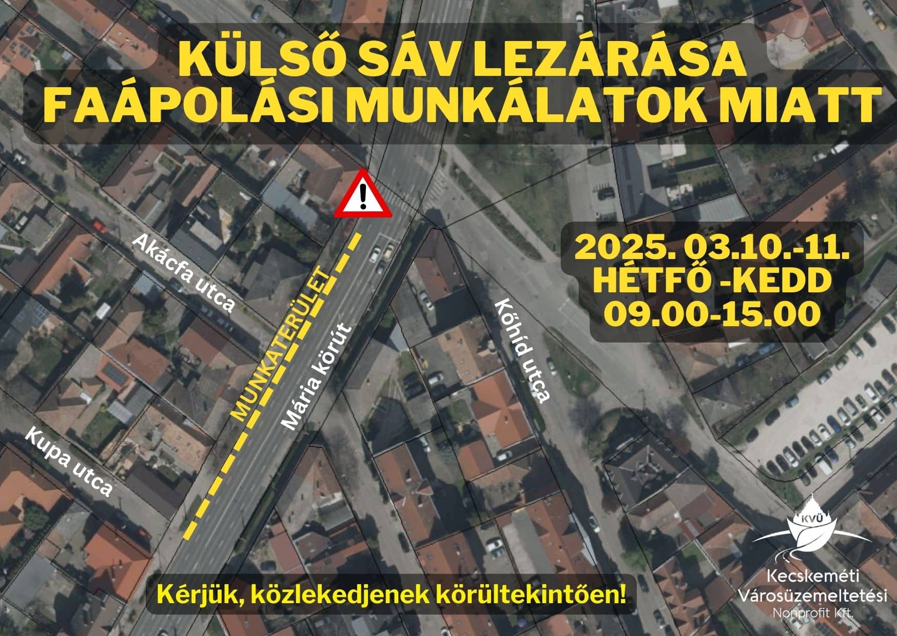 Március 10-én hétfőn és március 11-én kedden 9.00 és 15.00 óra között faápolási munkálatok miatt a Mária körút 22-28. számok előtti szakaszon a külső sávot lezárják - tájékoztatta szerkesztőségünket a Kecskeméti Városüzemeltetési Nonprofit Kft.