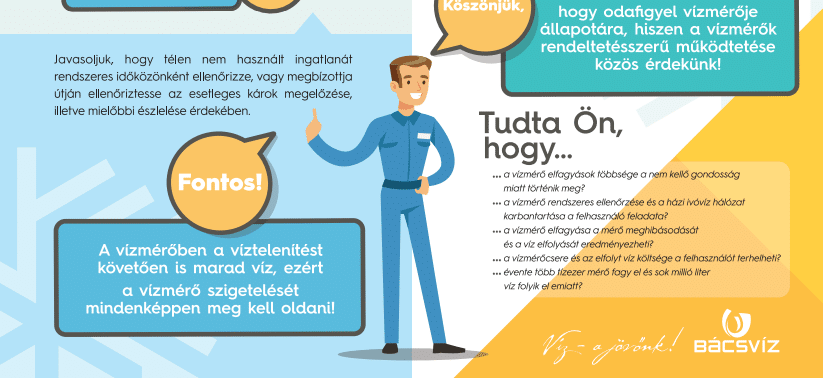 A tartós hideg komoly fagykárokat okozhat a vízmérőkben és a falakon belüli vízvezeték-hálózatban is. A meghibásodások pedig akár magasabb vízdíjhoz is vezethetnek. A Bácsvíz Zrt. kiadványából kiderül, mit tehetünk mindennek a megelőzésére különös tekintettel az aknákban, pincékben található vízmérőkre.