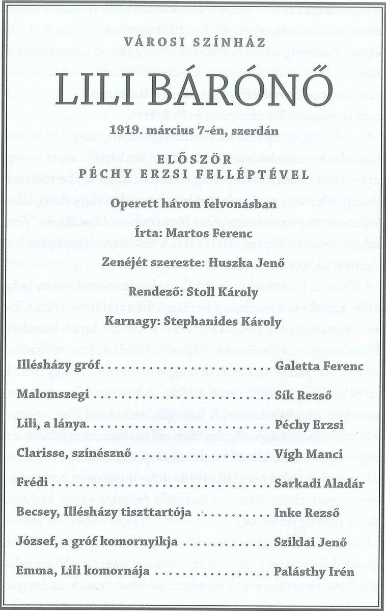 A Lili bárónő Huszka Jenő egyik legtöbbet játszott darabja. Béres Attila is már harmadik alkalommal vitte színre. Rendezése az Operettszínházban 19 éven át műsoron volt, Szentpéterváron pedig 2007 óta folyamatosan játsszák. Huszka Zsuzsa Kecskeméten is örömmel hallgatta a Lili bárónő jól ismert dallamait, amiket sokat dúdol magában is. „A Bíborban ég kezdetű dal számomra a legkedvesebb. Ebben azt énekli Lili, hogy: »egy férfi képe van a szívem közepében«. Ez mindig megmelengeti a szívemet. Harminc éve vagyok házas, de úgy érzem, hogy egy ilyen daltól akár a szerelem is újra felpezsdül. Fontos, hogy újra és újra észrevegyük, hogy ott van mellettünk a boldogság.”