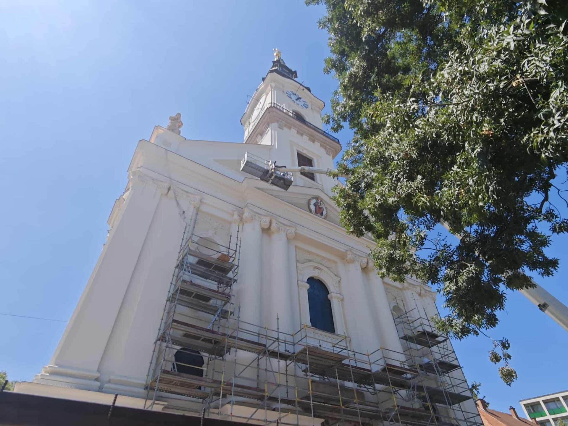 Elkészült a Nagytemplom erkélye és tornya, már csak az első homlokzat van felállványozva, ám ez is pár héten belül lekerül, és új fényben fog tündökölni Kecskemét belvárosának éke.
